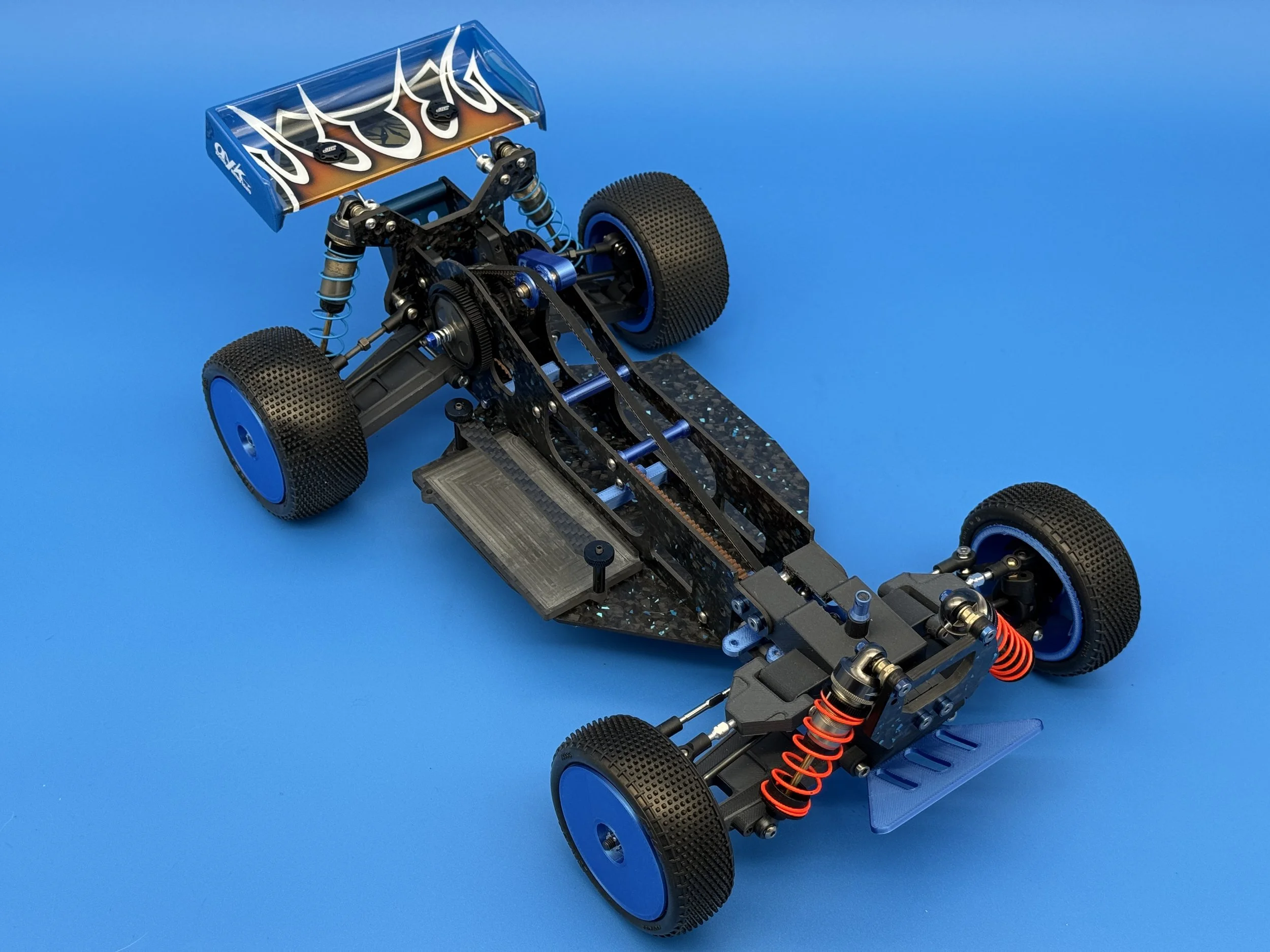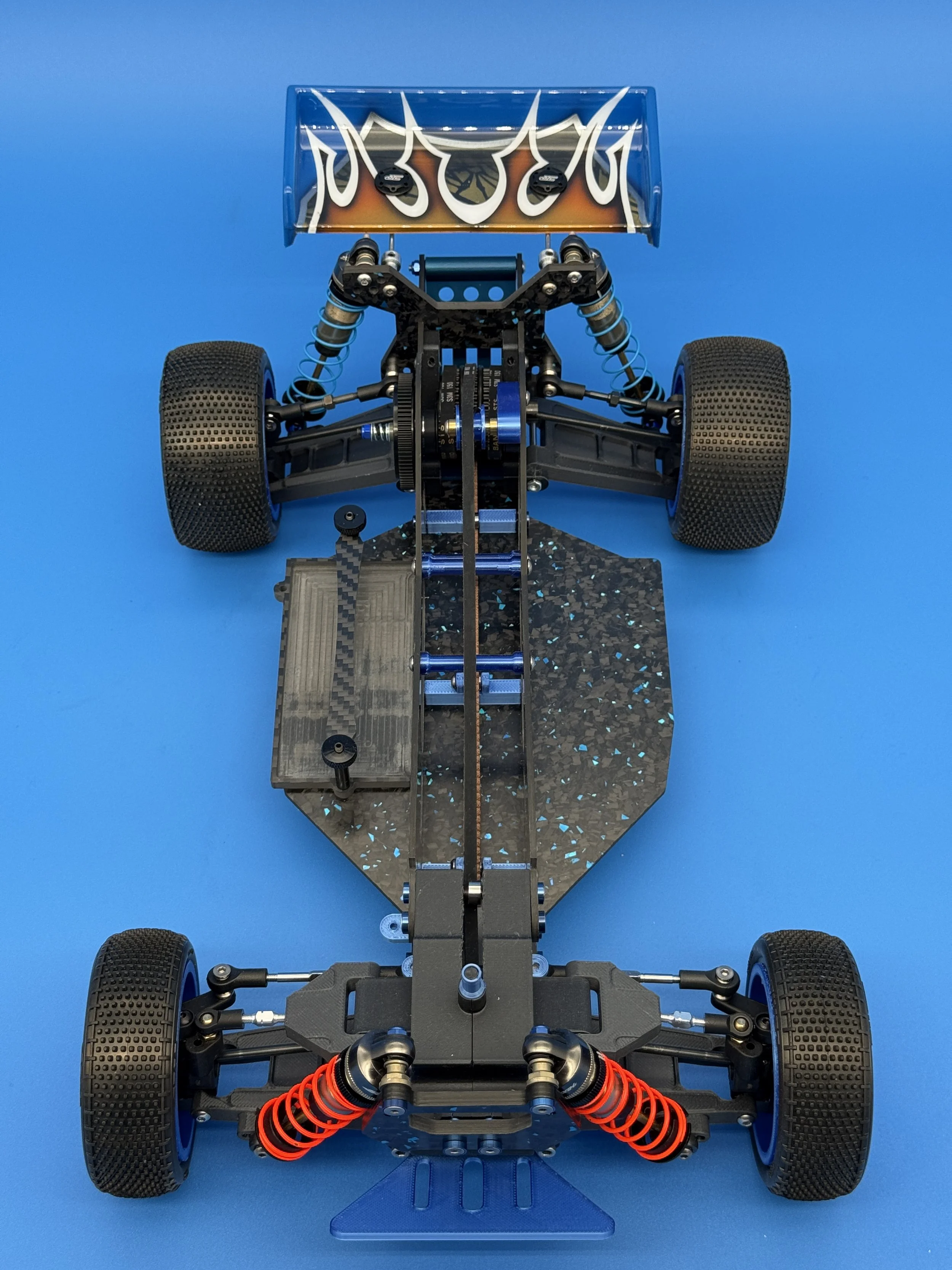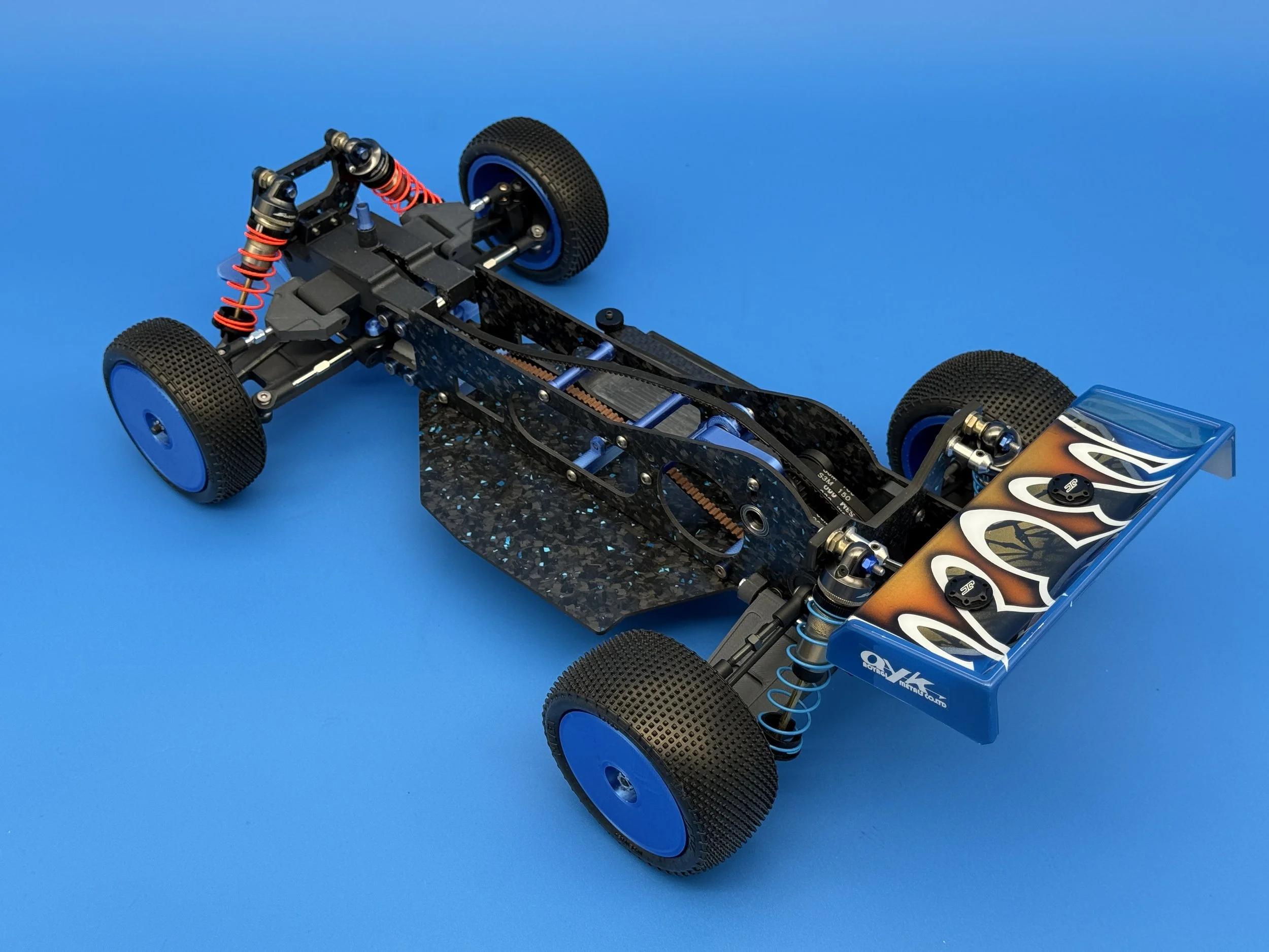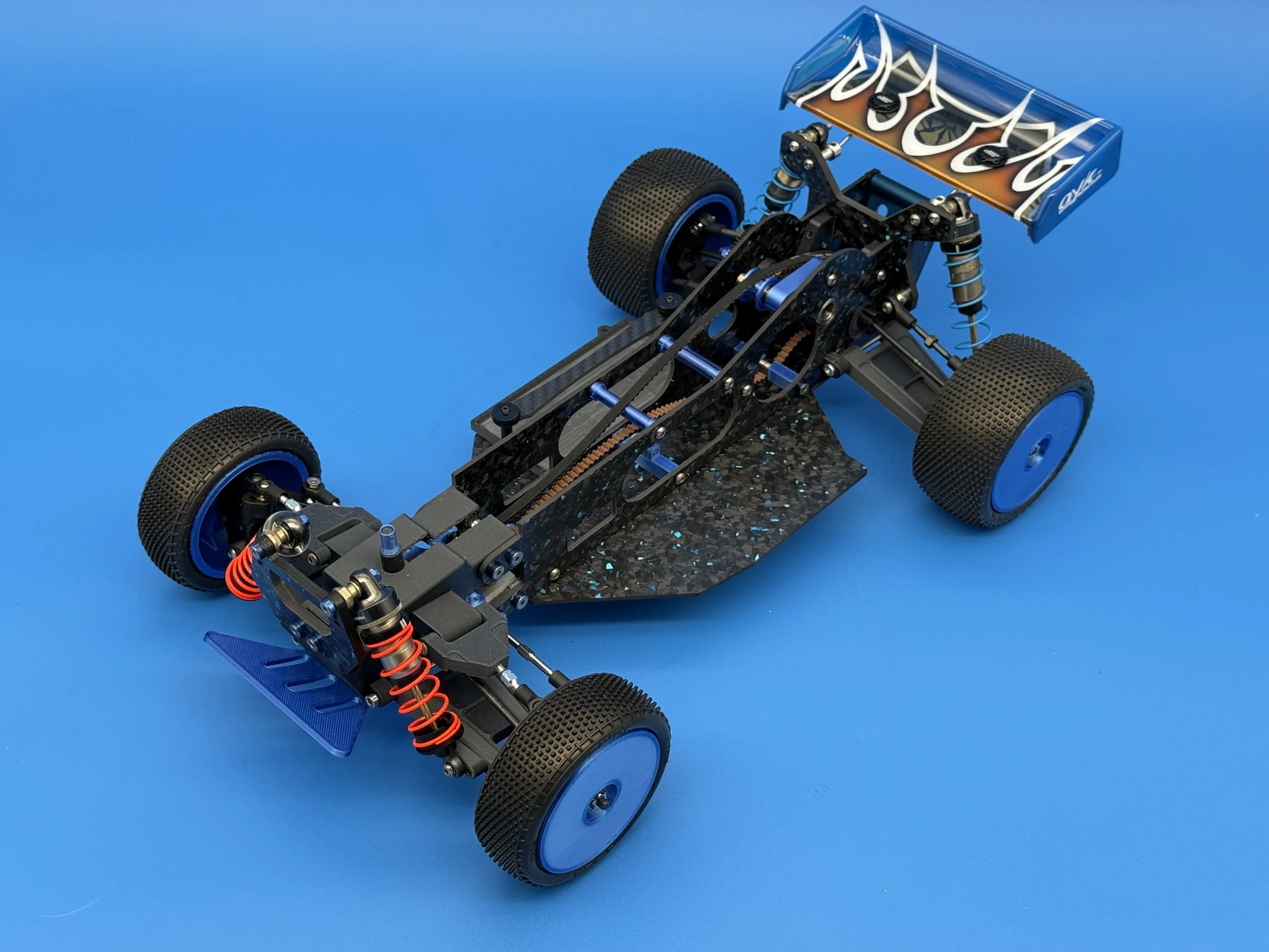 This car uses a race-prep inspired chassis without cell cutouts made from carbon forge with blue flakes.