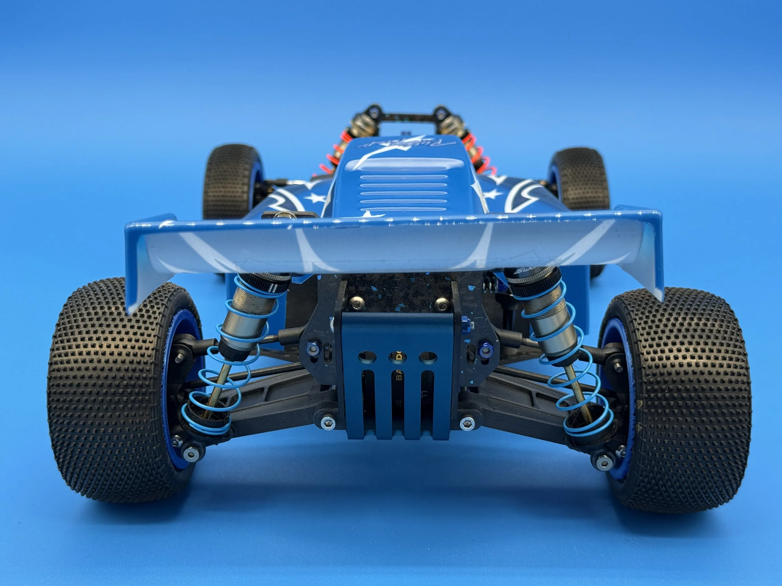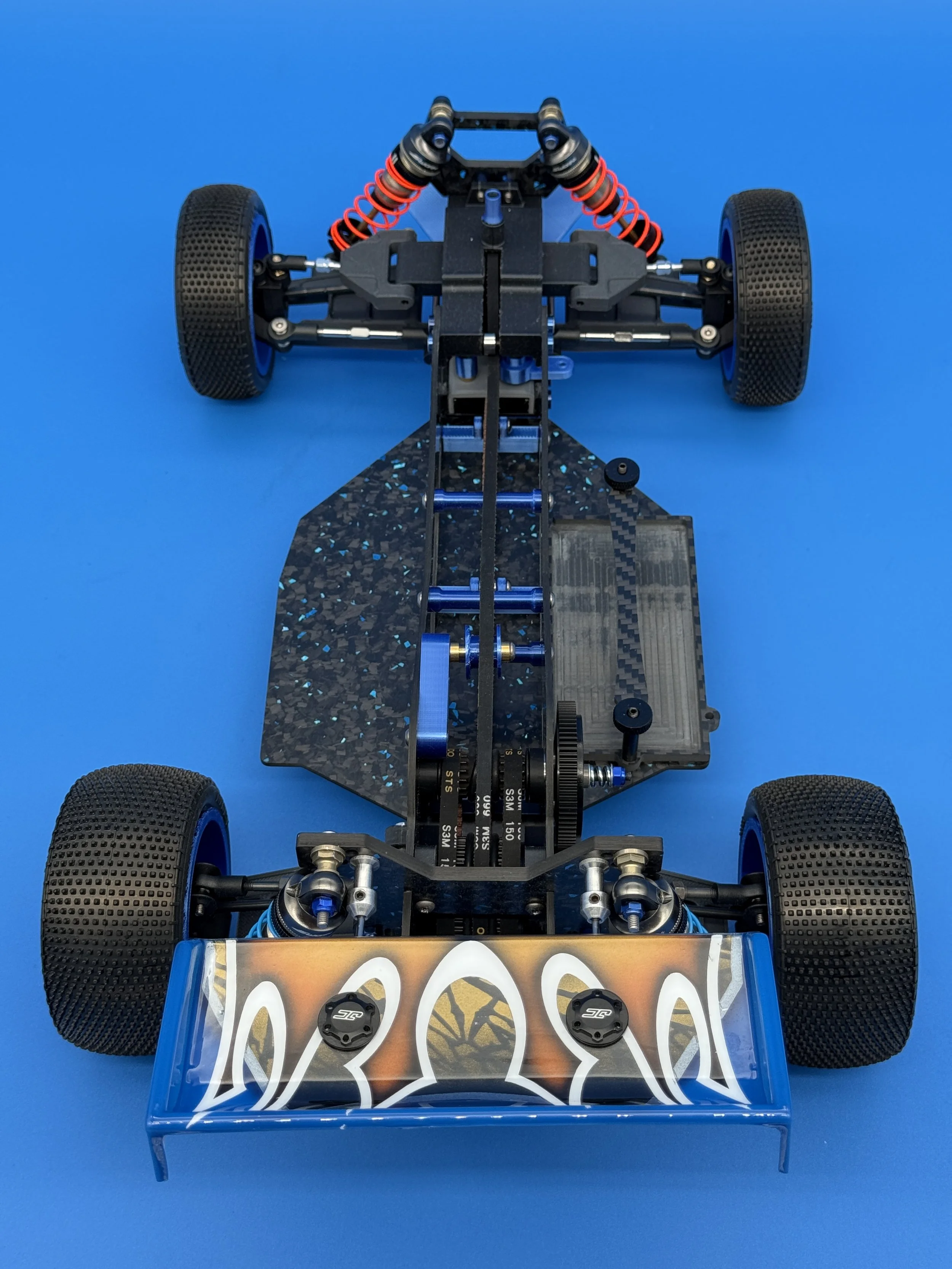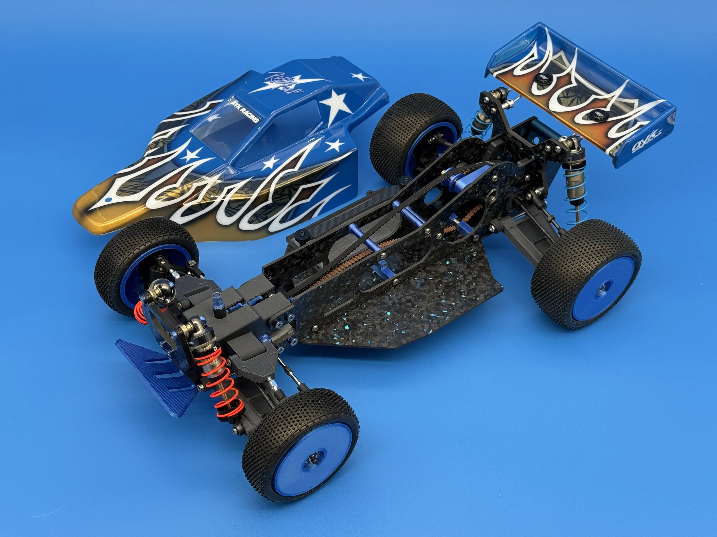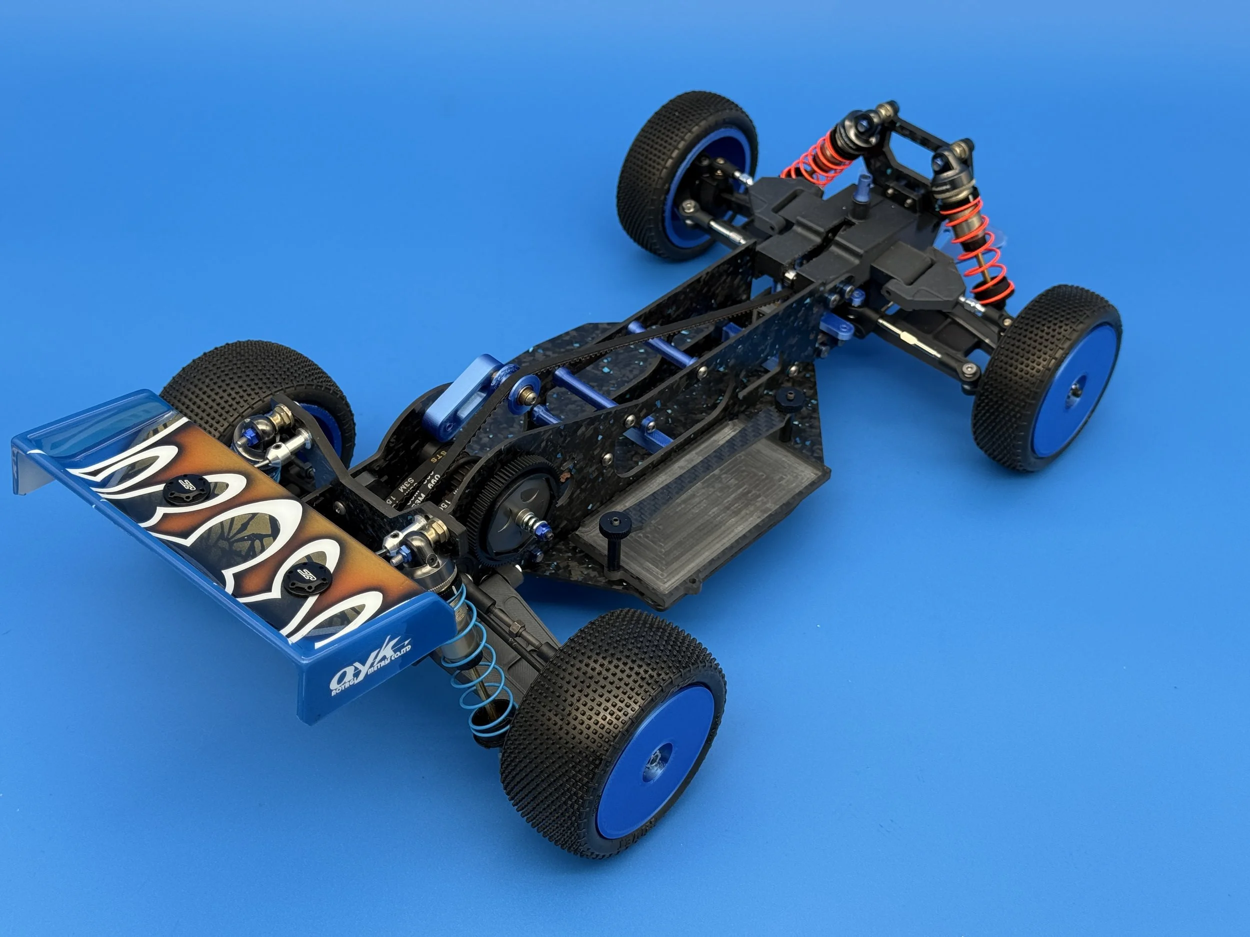 This car uses a race-prep inspired chassis without cell cutouts made from carbon forge with blue flakes.
