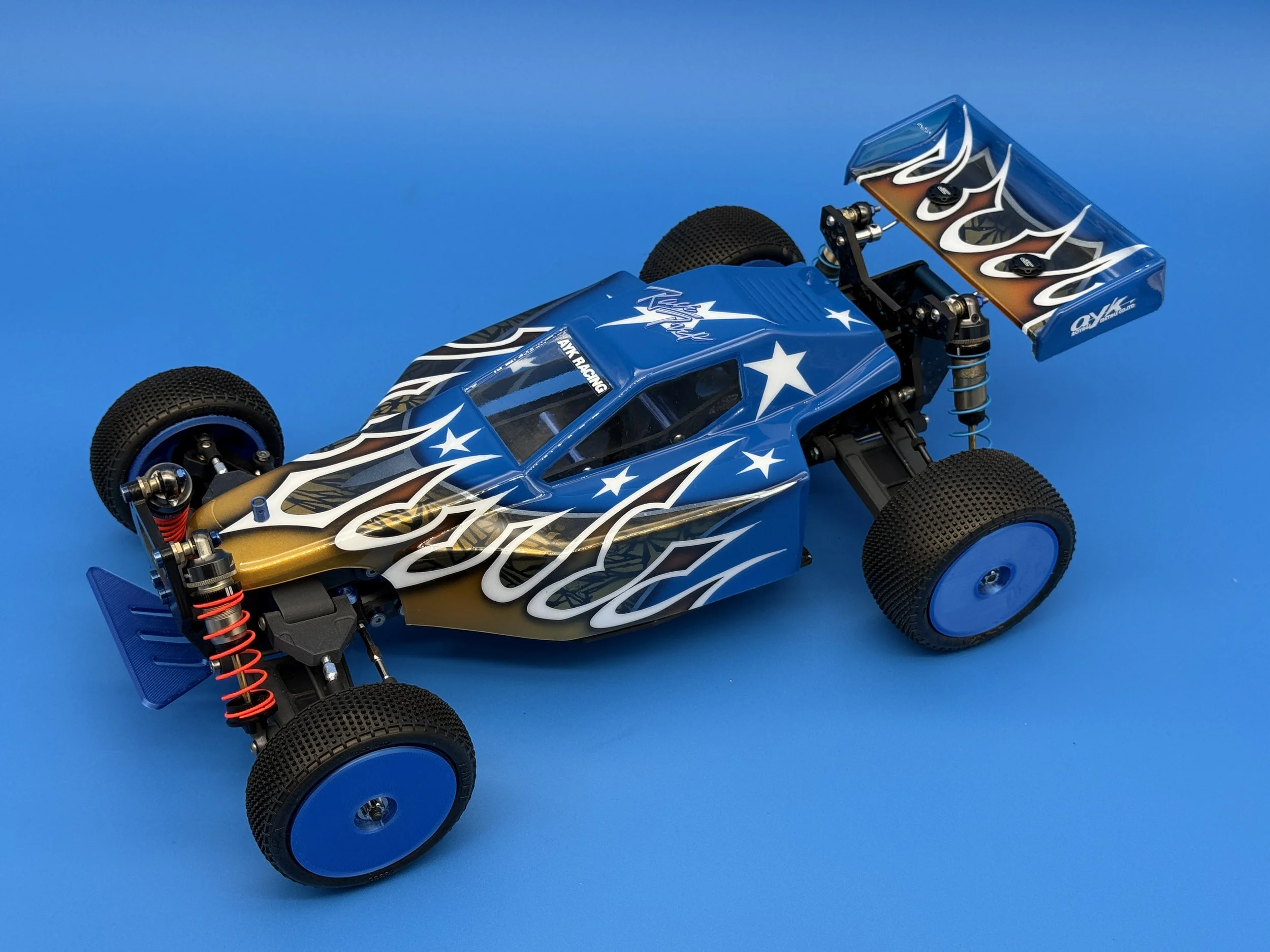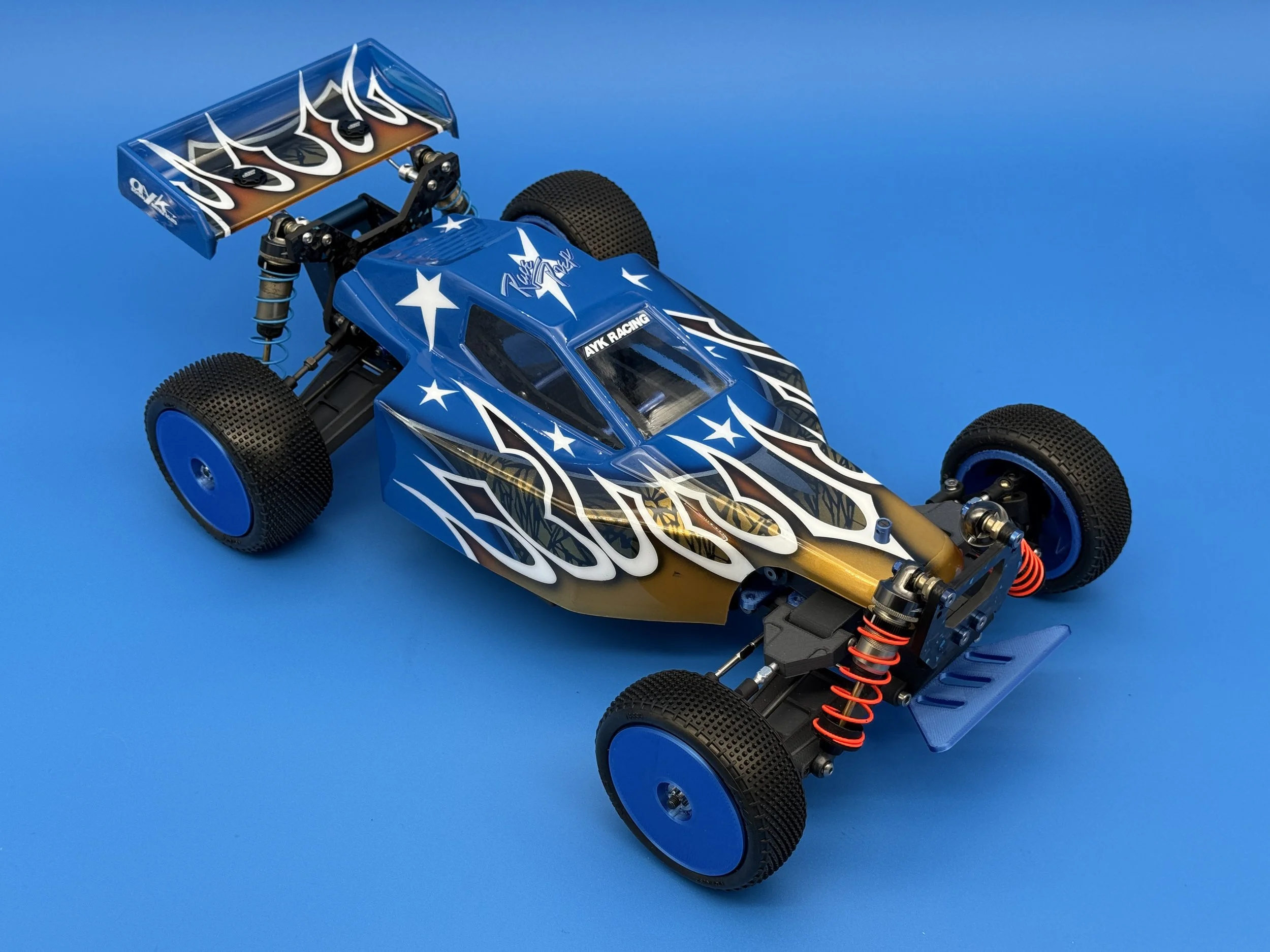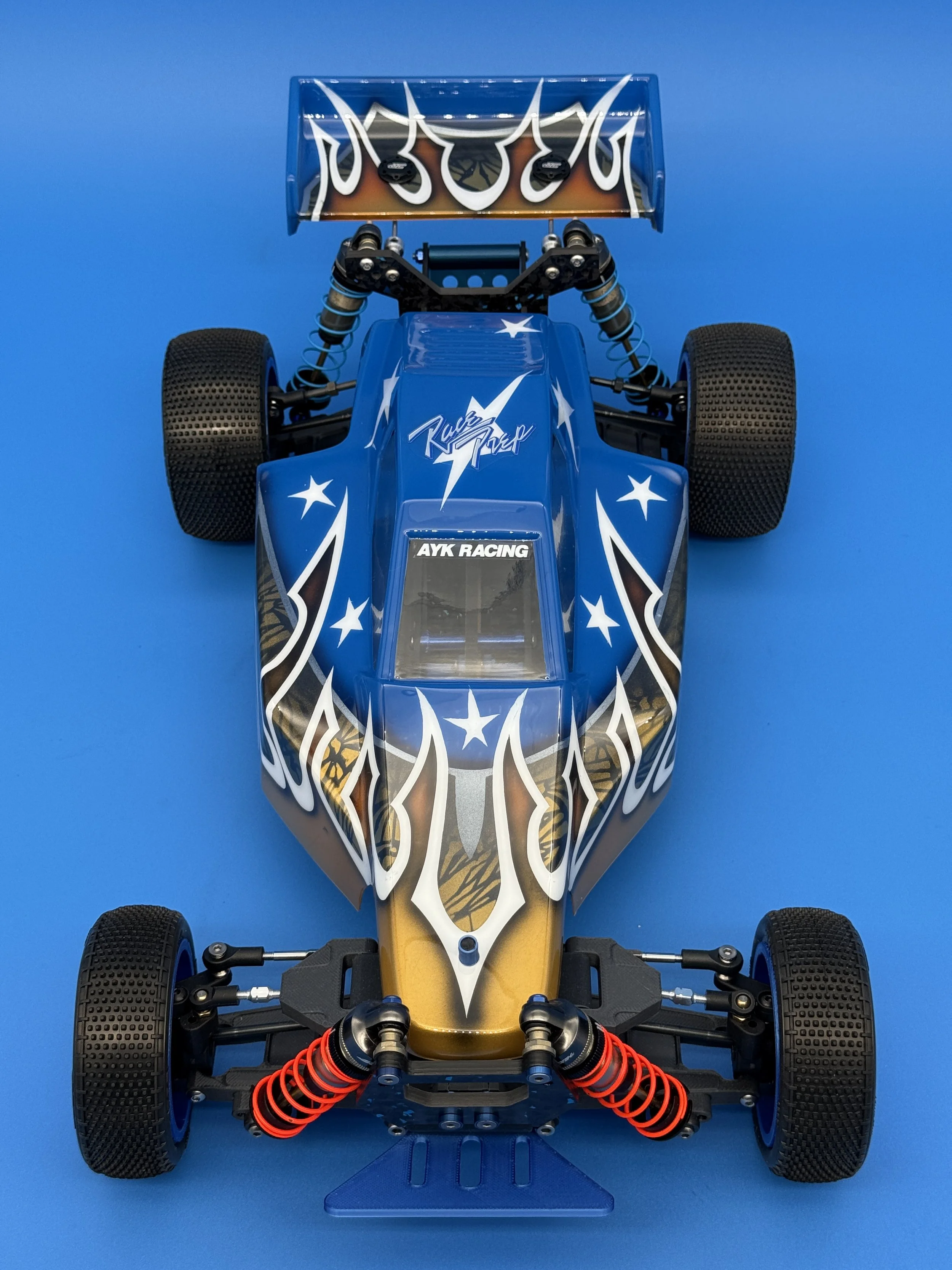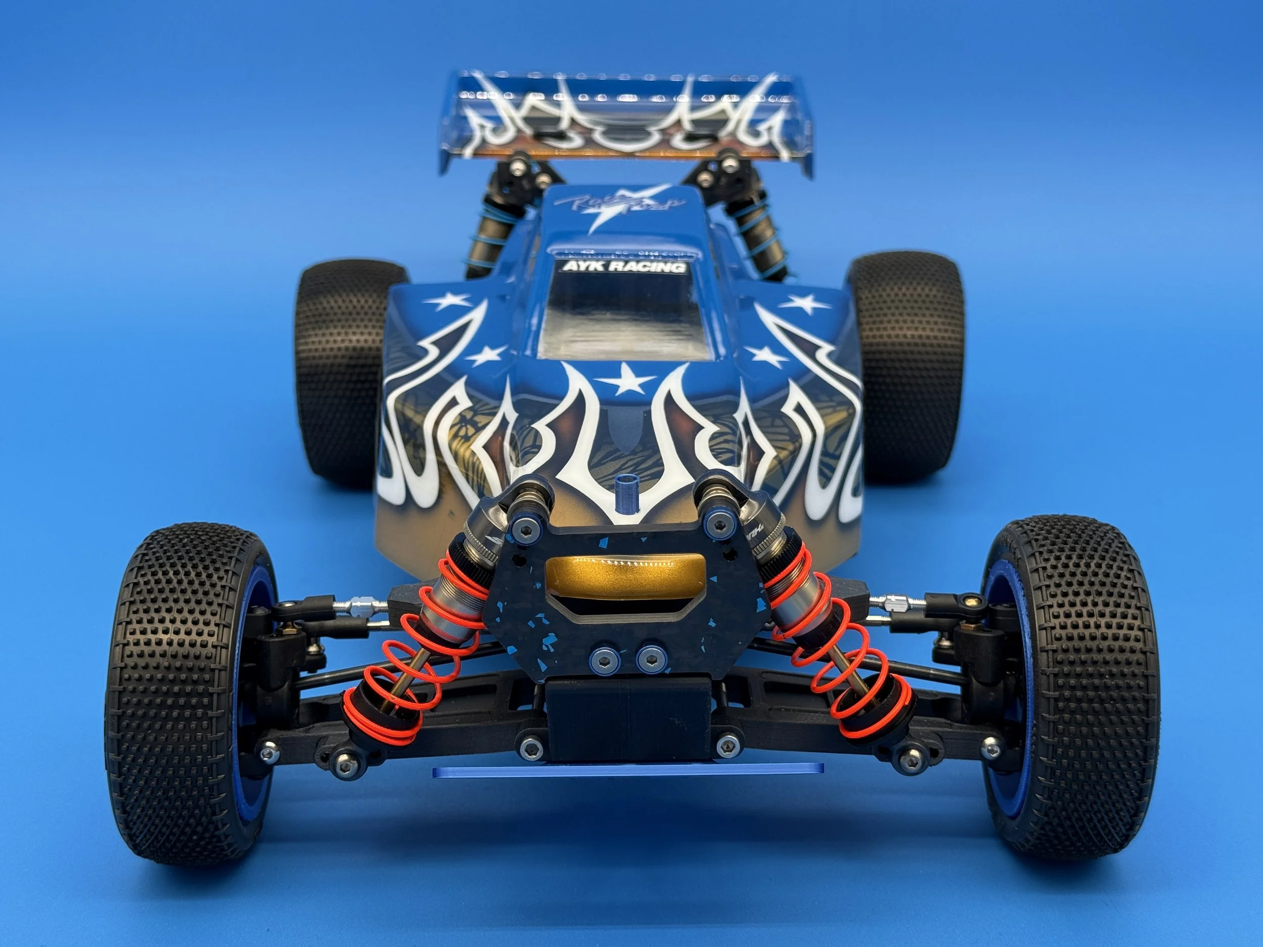 This car uses a race-prep inspired chassis without cell cutouts made from carbon forge with blue flakes.
