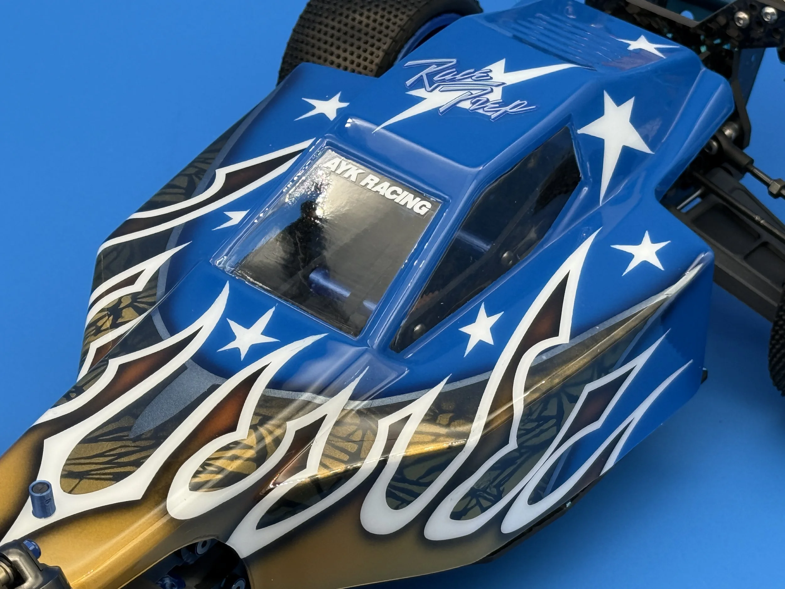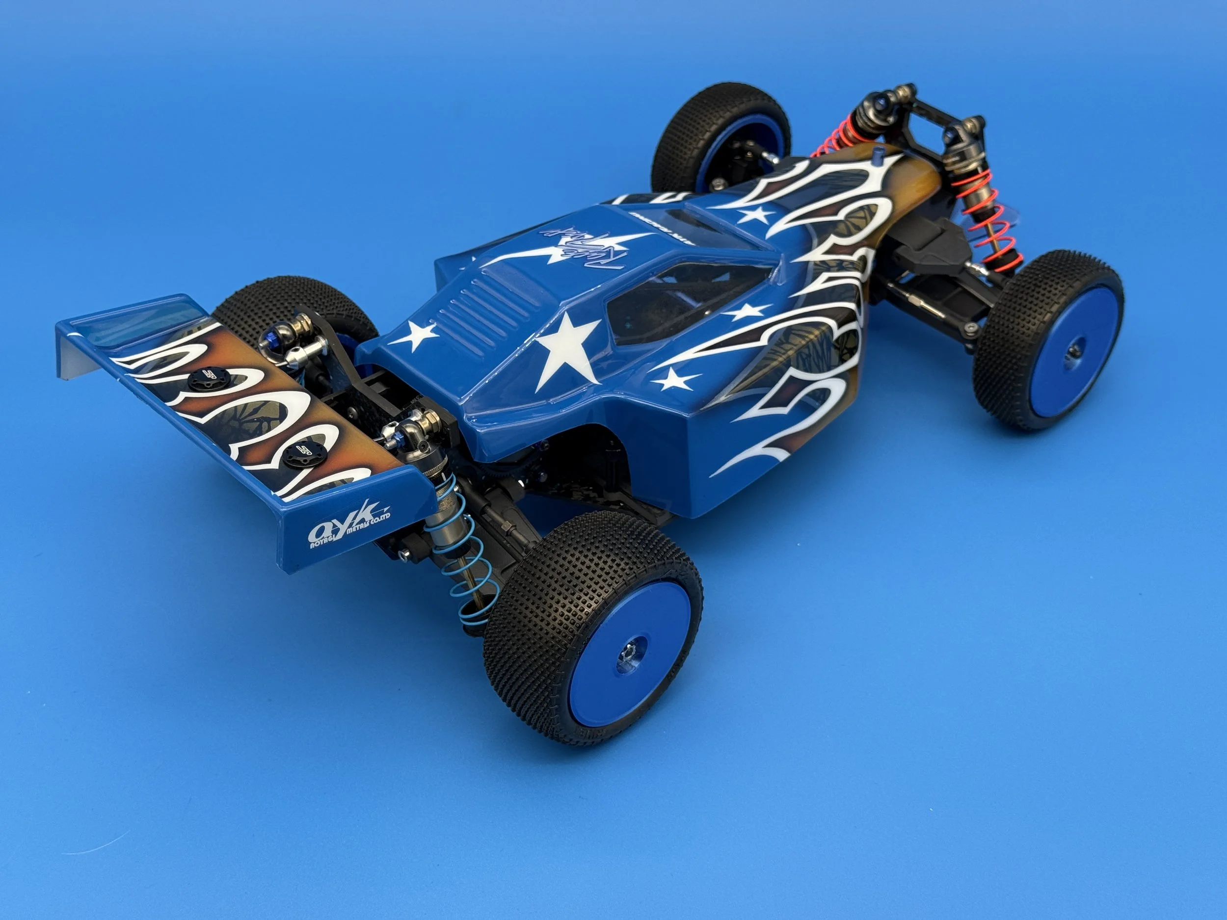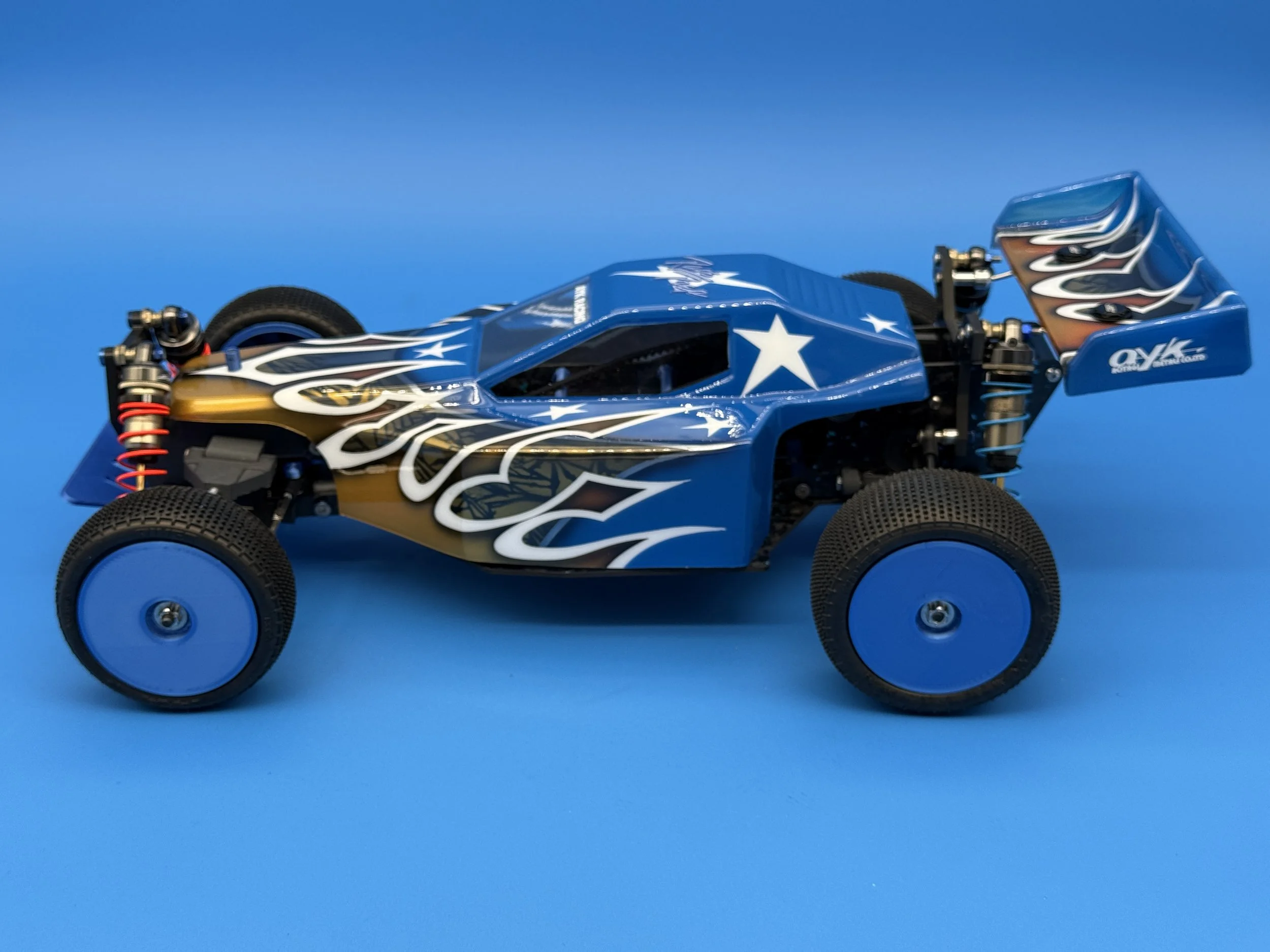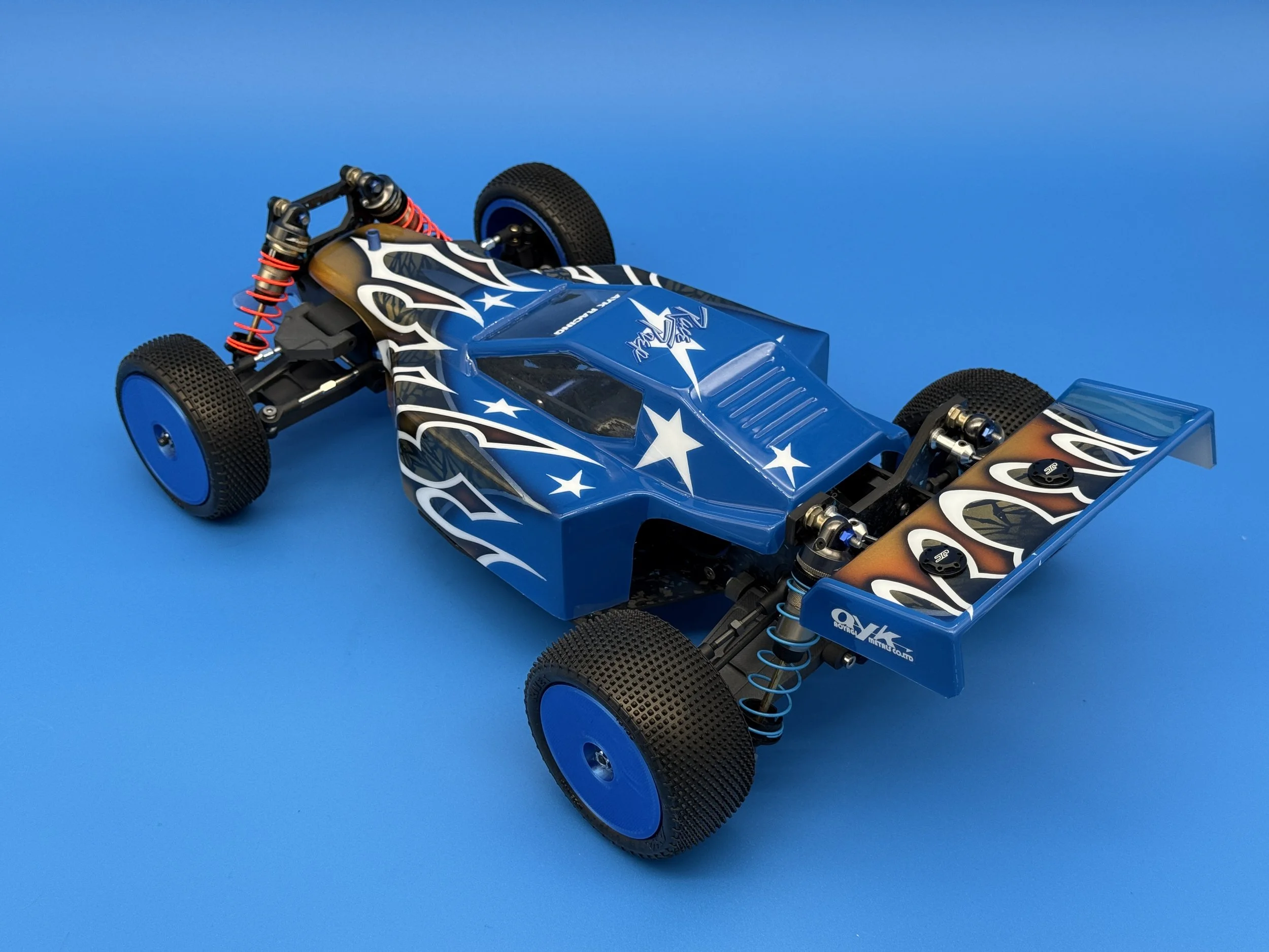 This car uses a race-prep inspired chassis without cell cutouts made from carbon forge with blue flakes.