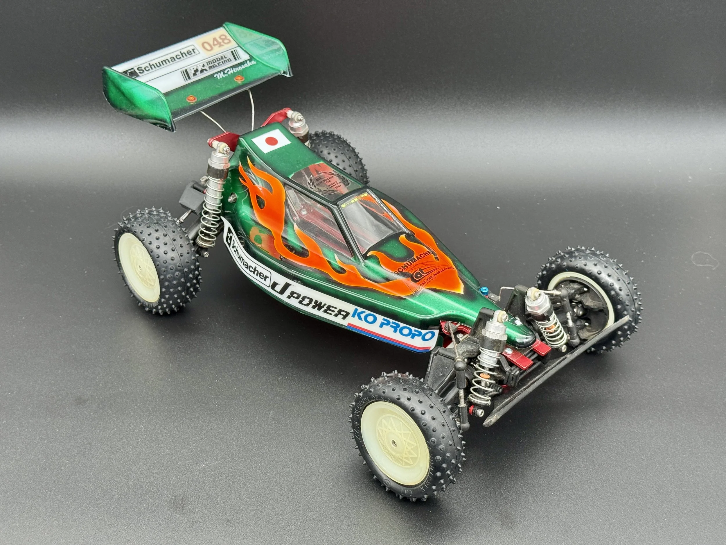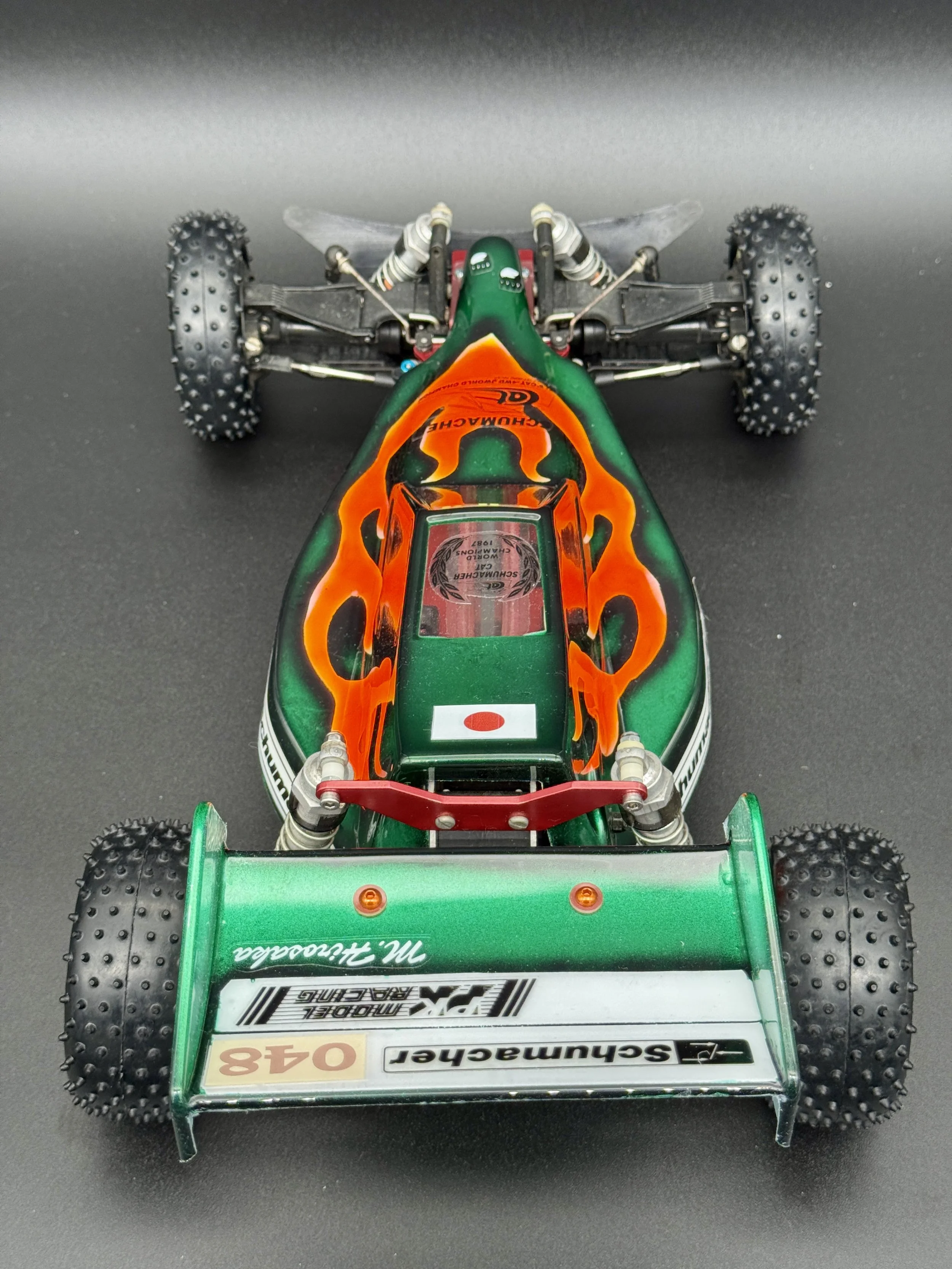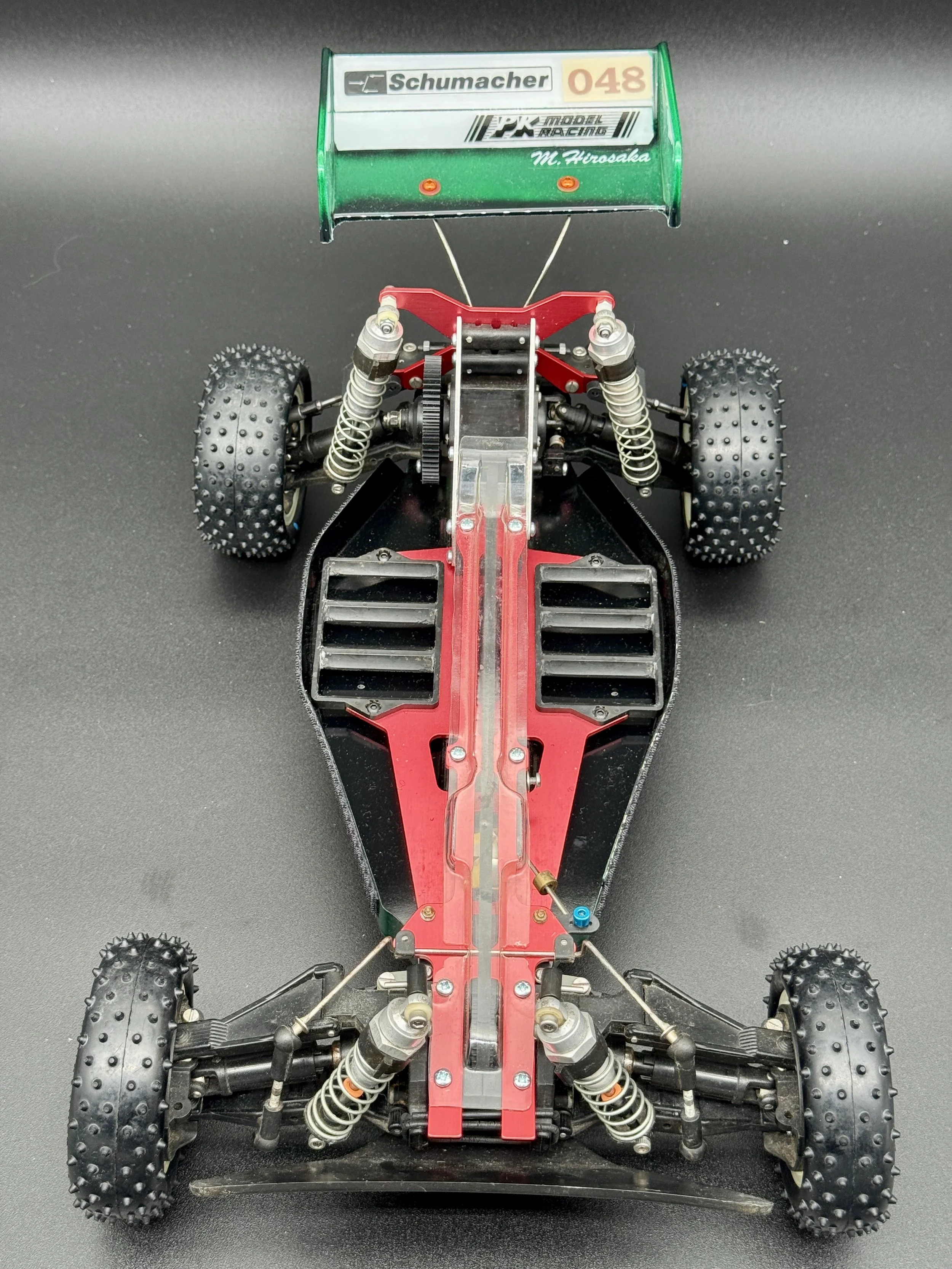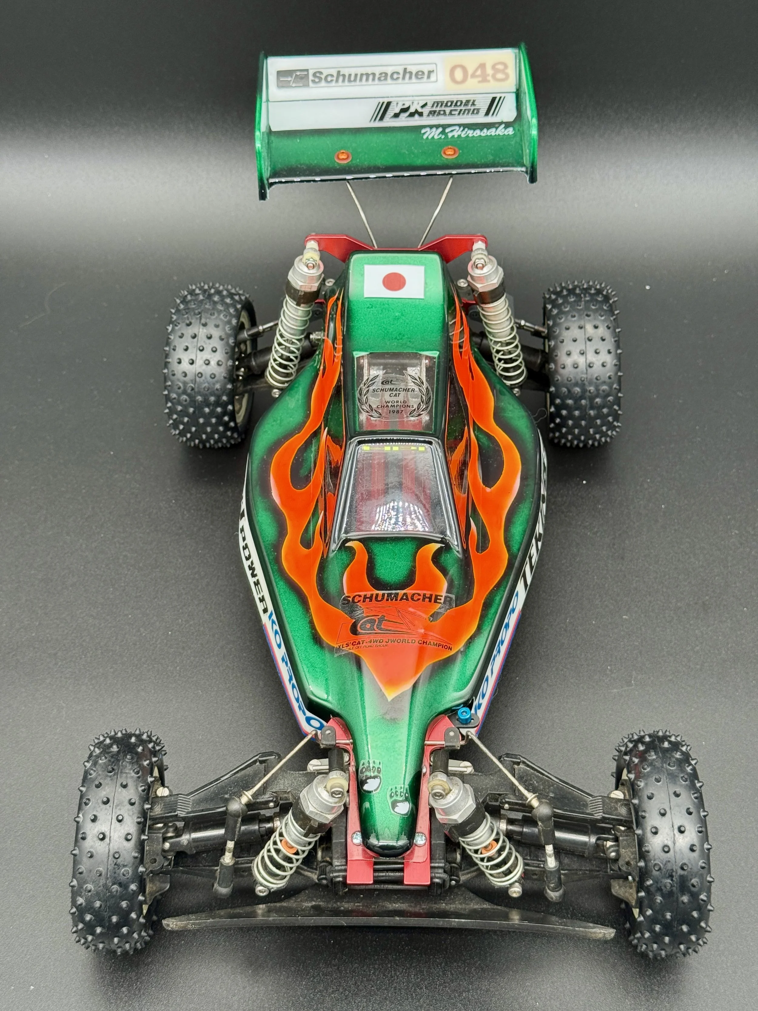 Schumacher CAT XLS fitted with the PK Corally red alloy upgrades. Fitted with a body inspired by Massami Hirosaka’s Romsey paint scheme.