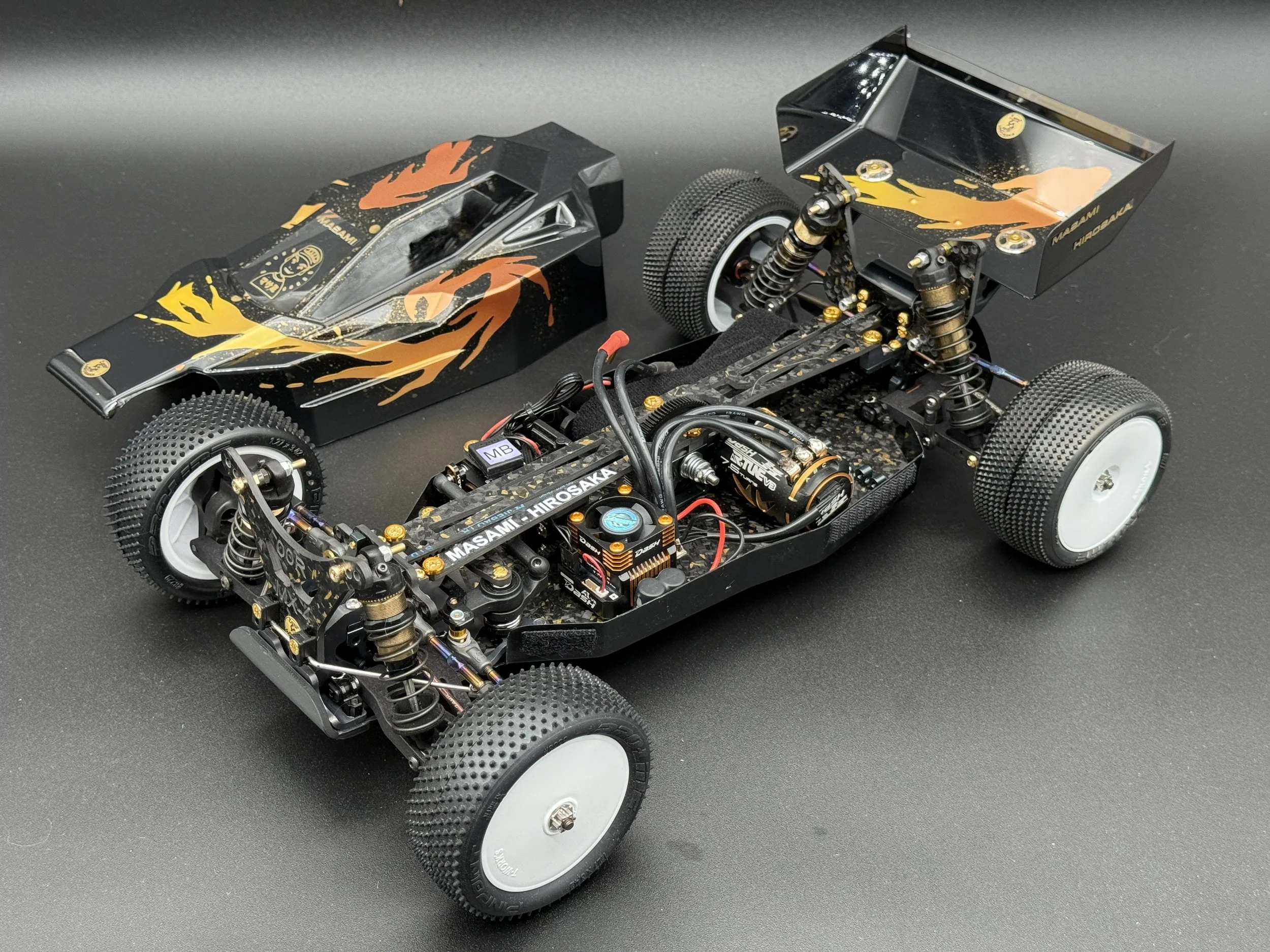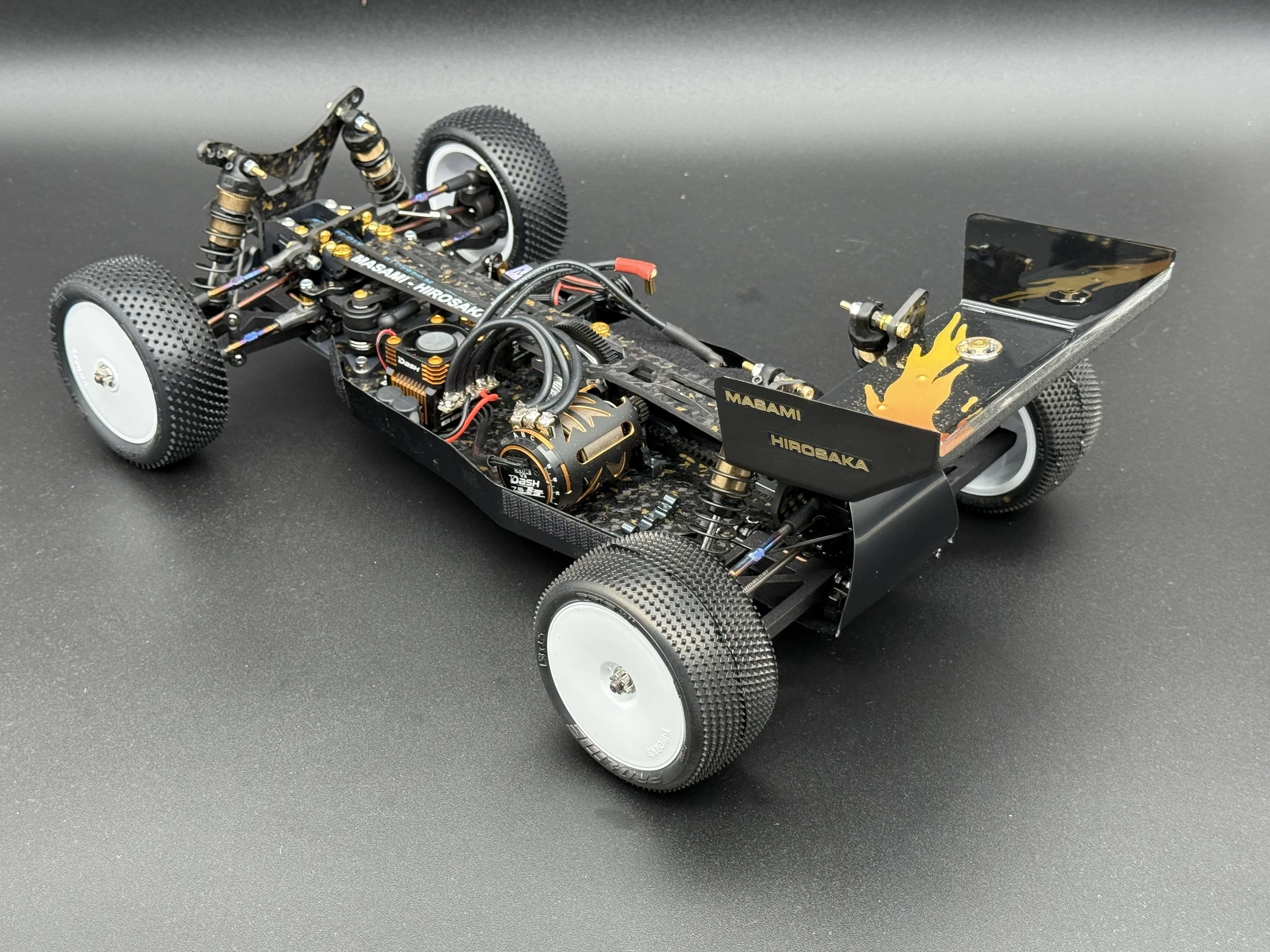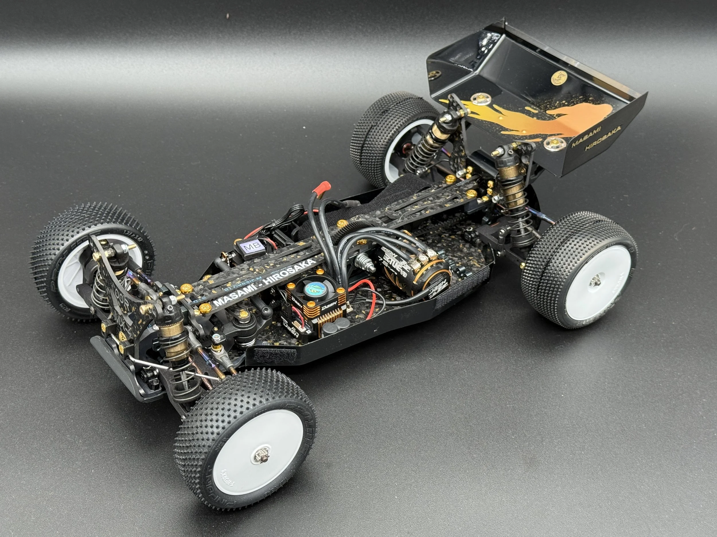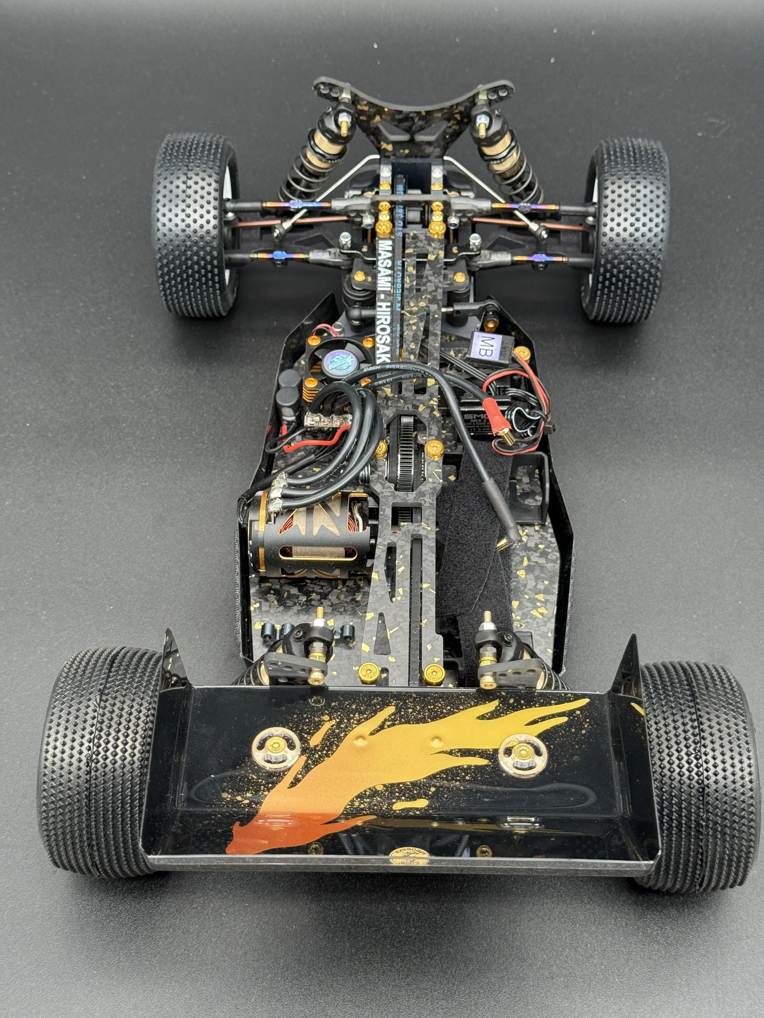 The car sports a carbon forge chassis with gold flakes. All alloys are gun-metal anodised. The arms are rapid-prototyped from MLF. Modern Yokomo big bore shocks, burnt-titanium turnbuckles, modern XRAY and Schumacher ballcups. I also fitted sway bars front and rear.