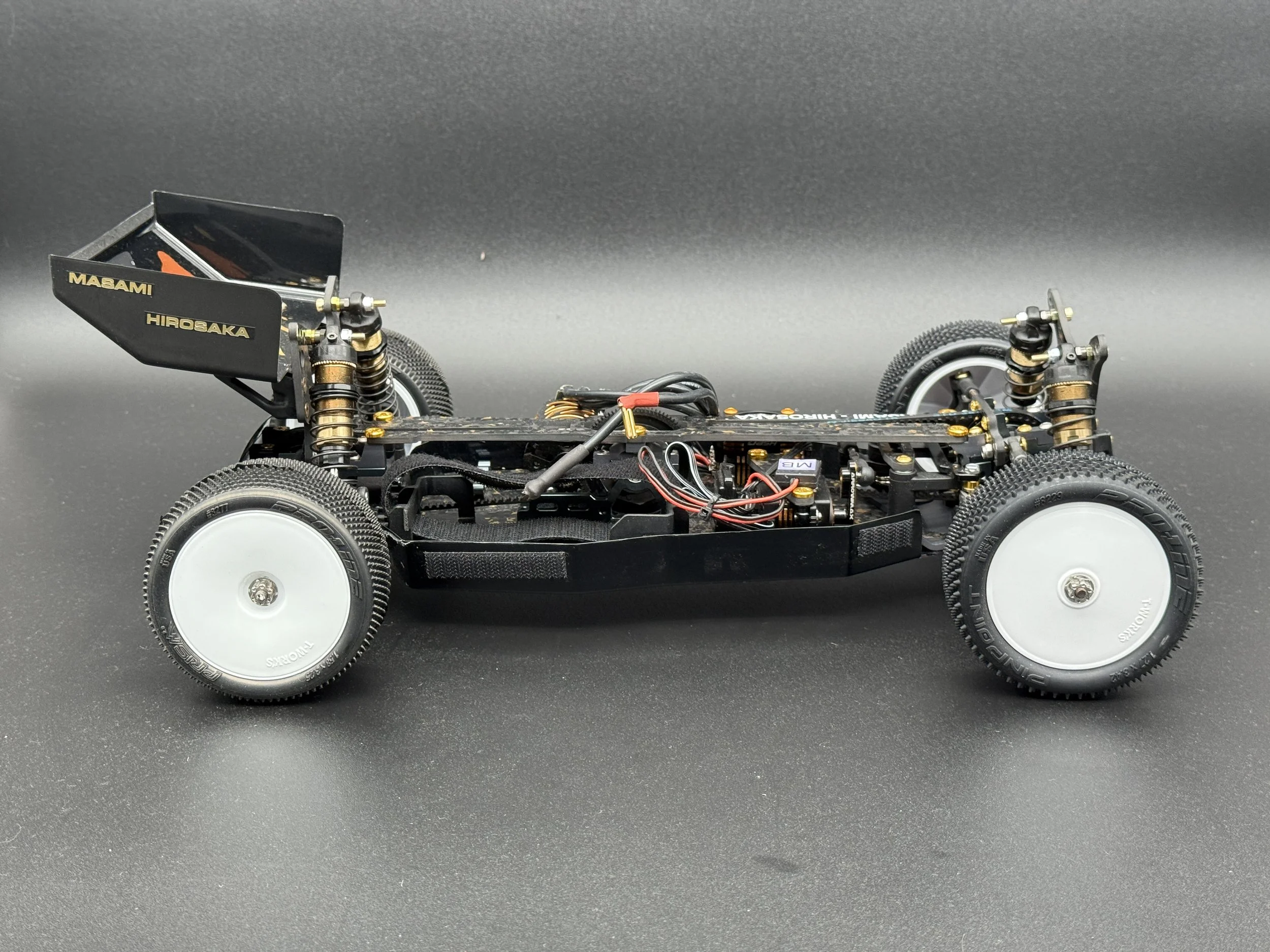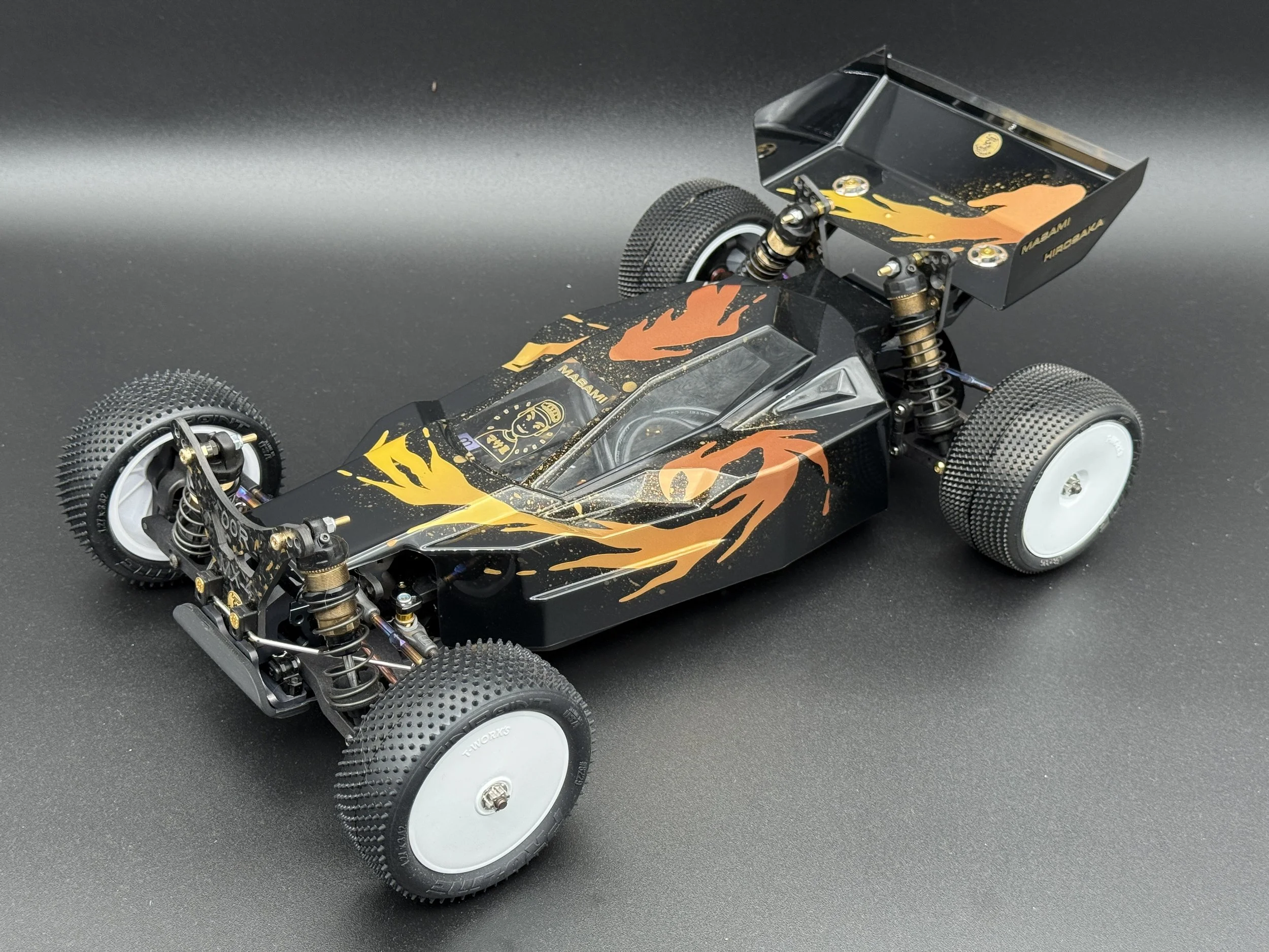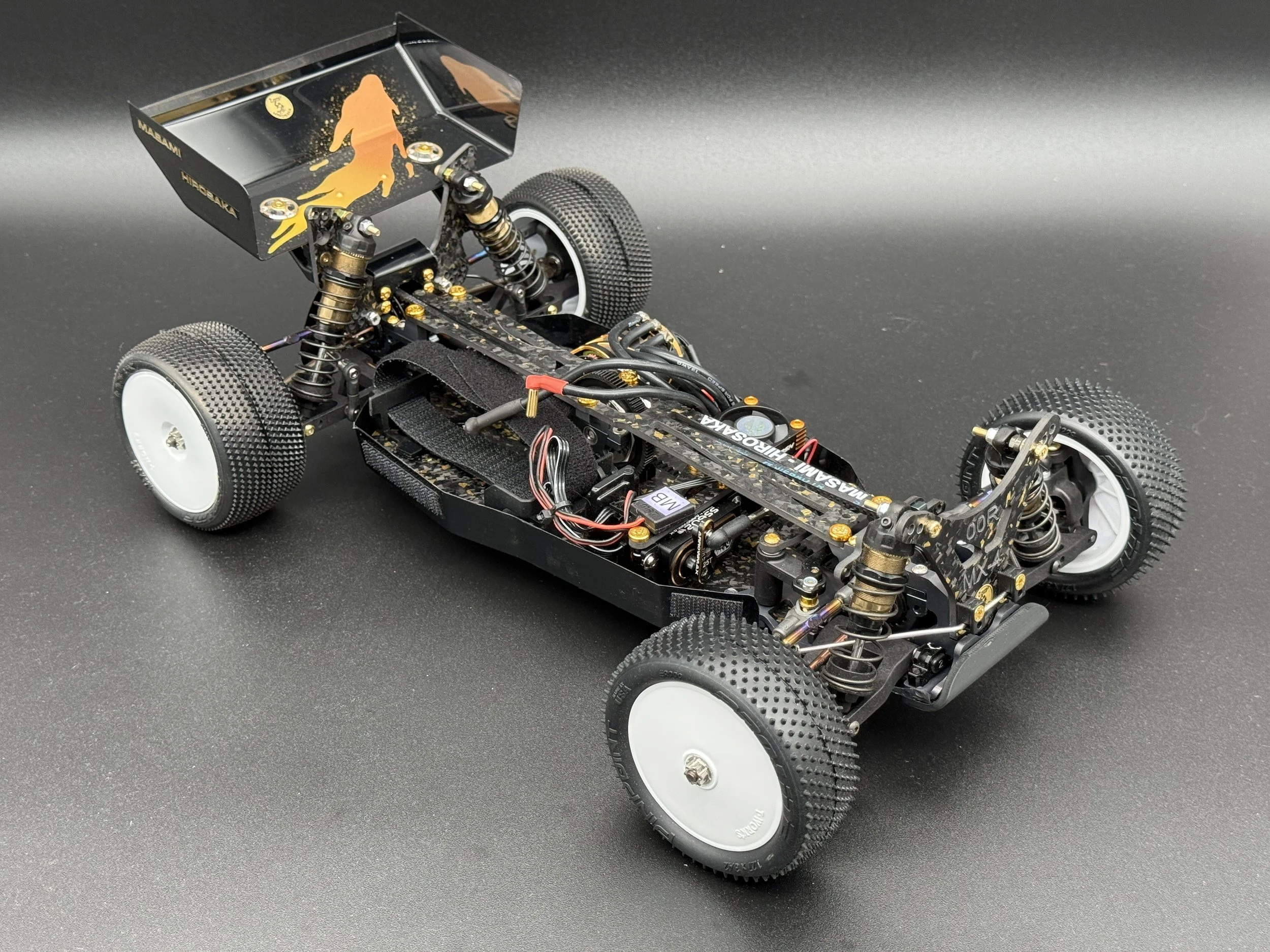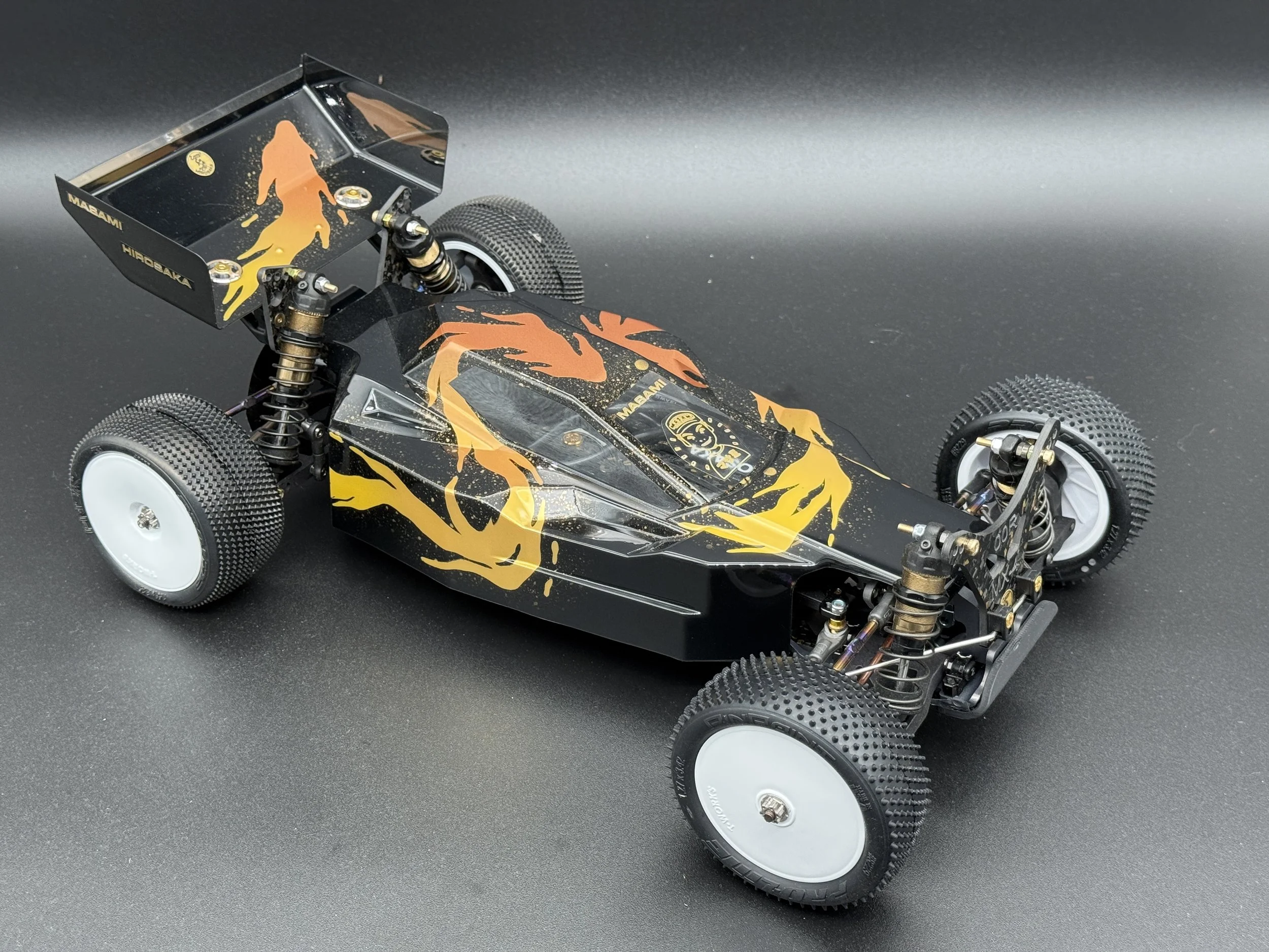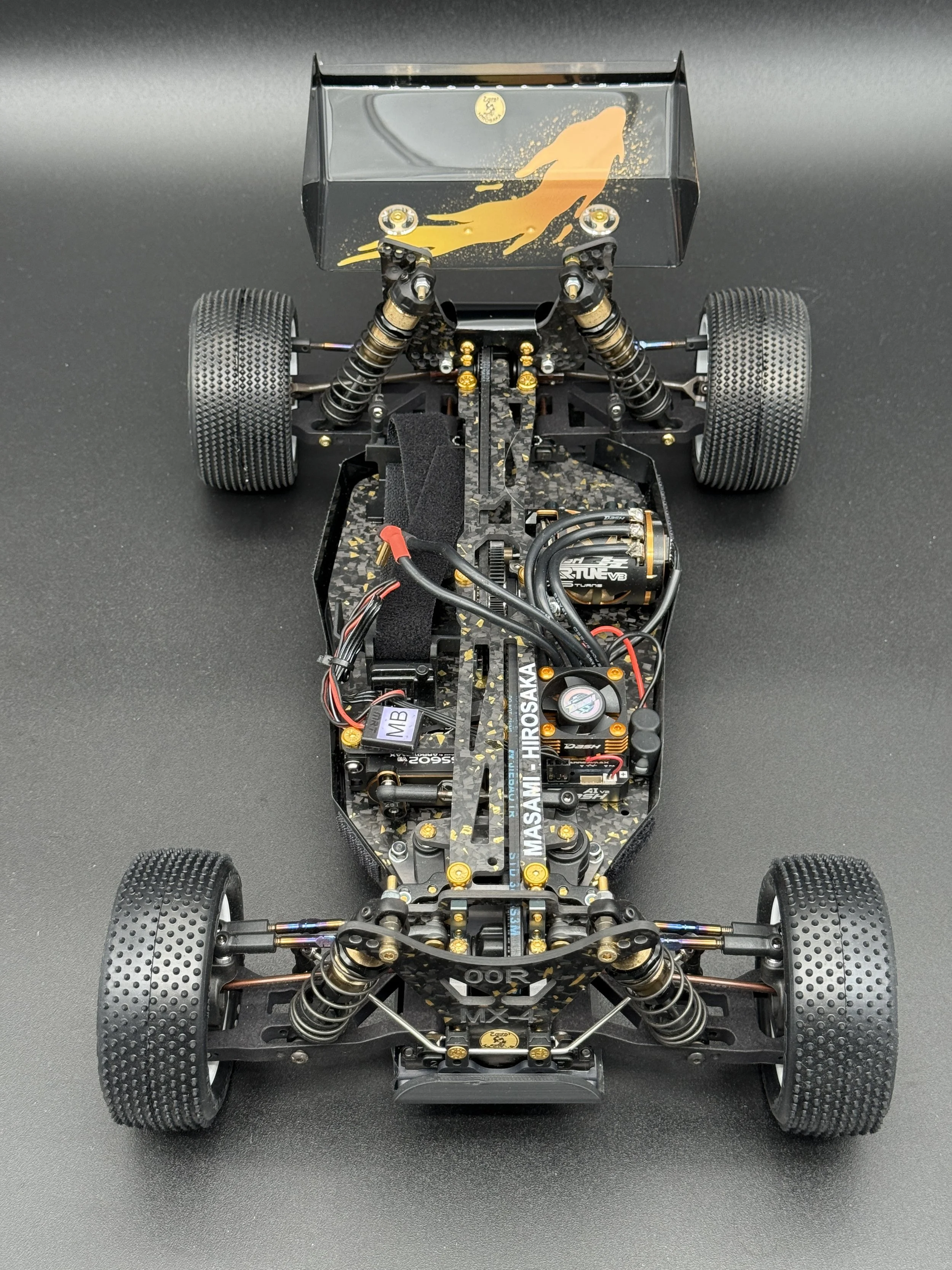 The car sports a carbon forge chassis with gold flakes. All alloys are gun-metal anodised. The arms are rapid-prototyped from MLF. Modern Yokomo big bore shocks, burnt-titanium turnbuckles, modern XRAY and Schumacher ballcups. I also fitted sway bars front and rear.