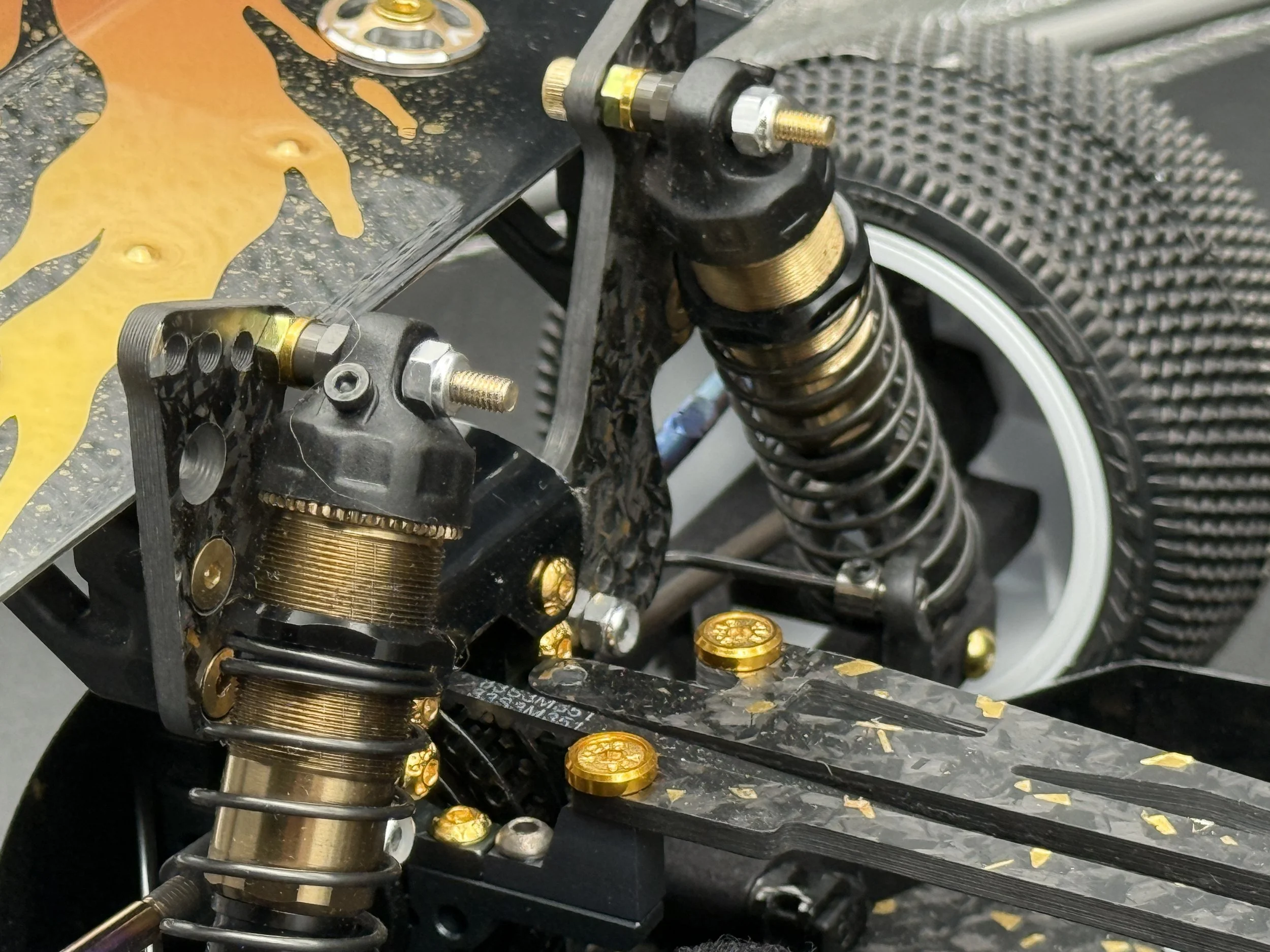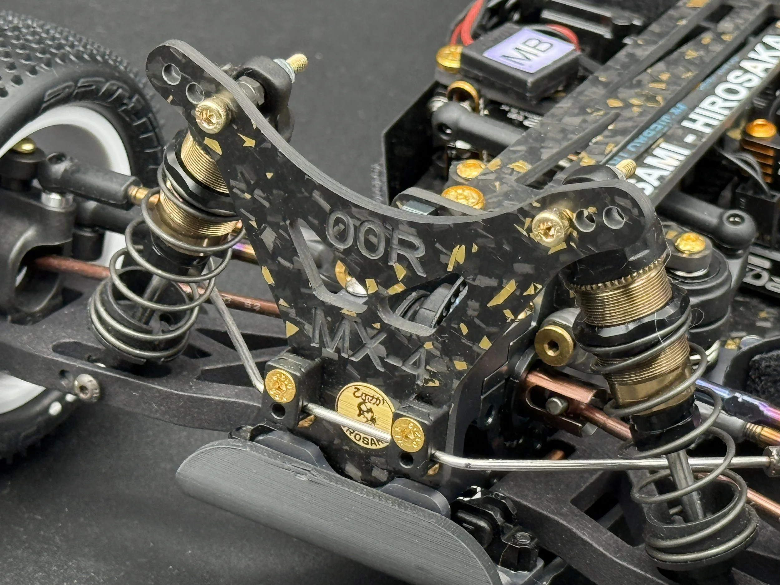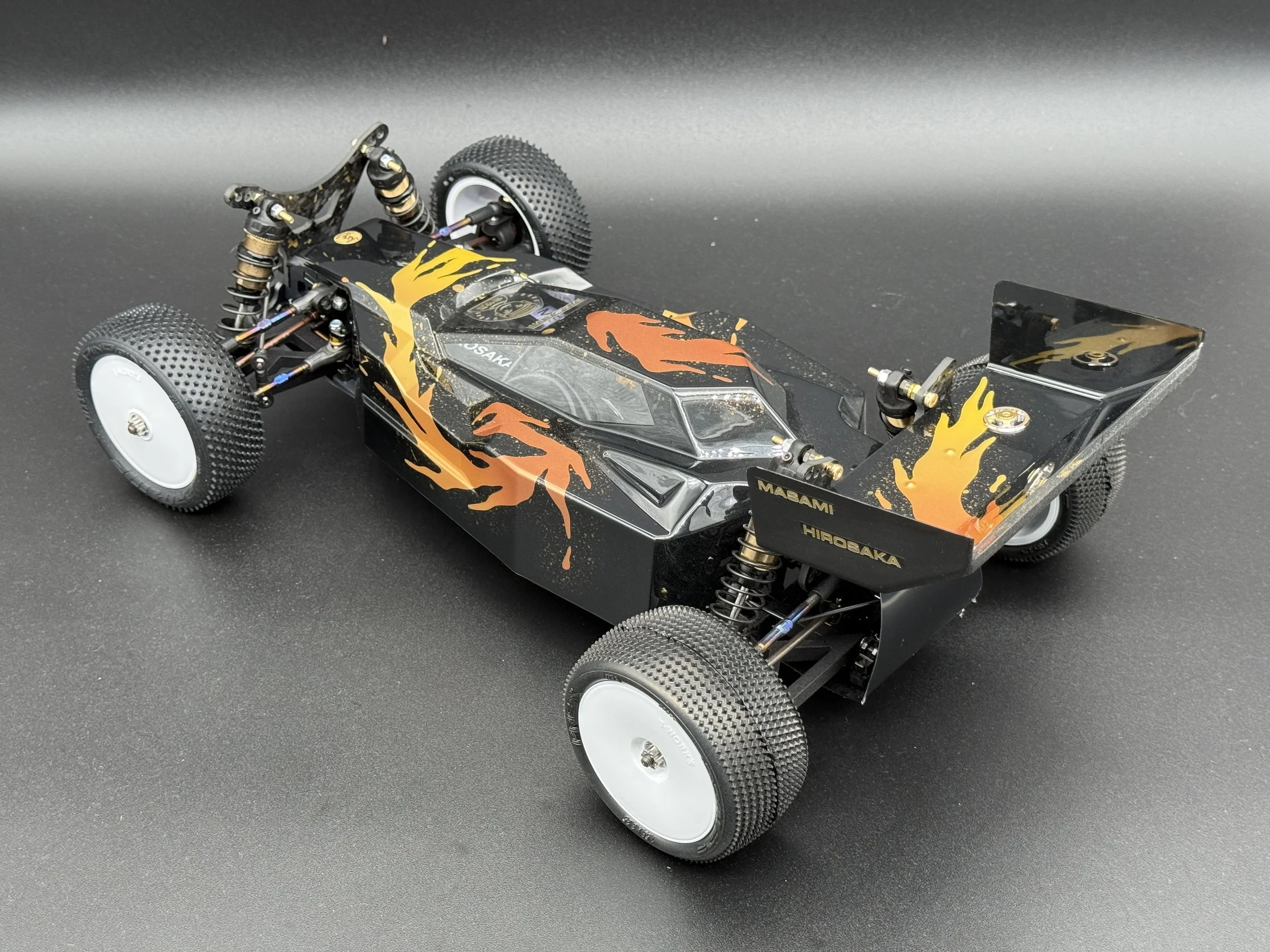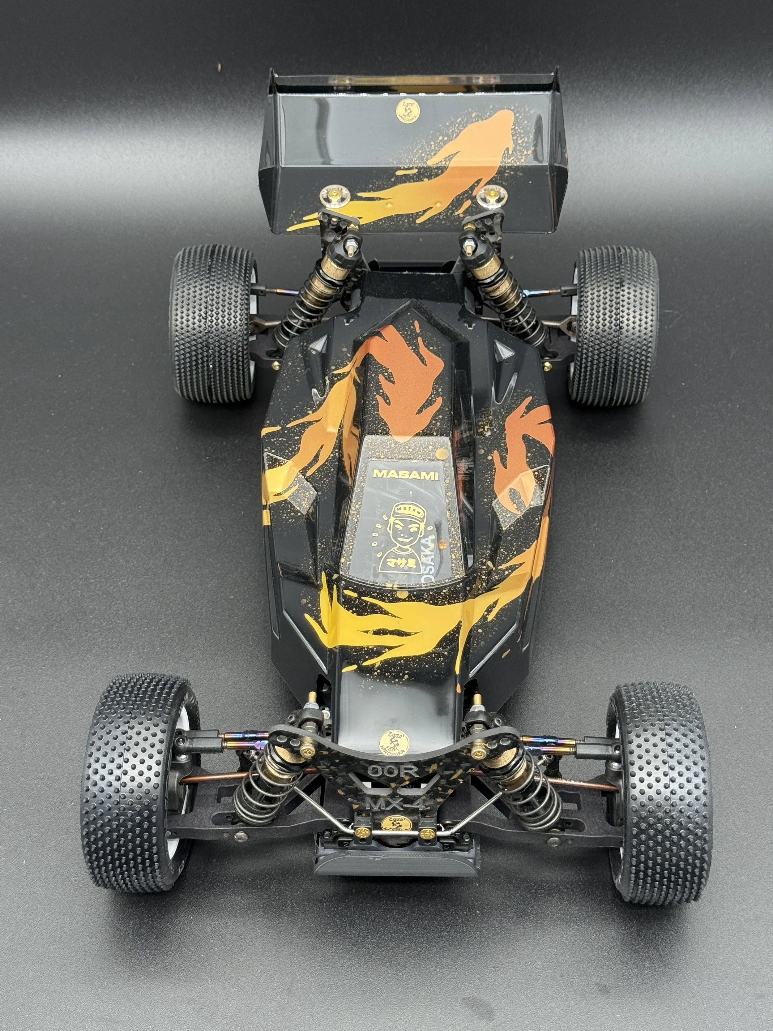 The car sports a carbon forge chassis with gold flakes. All alloys are gun-metal anodised. The arms are rapid-prototyped from MLF. Modern Yokomo big bore shocks, burnt-titanium turnbuckles, modern XRAY and Schumacher ballcups. I also fitted sway bars front and rear.