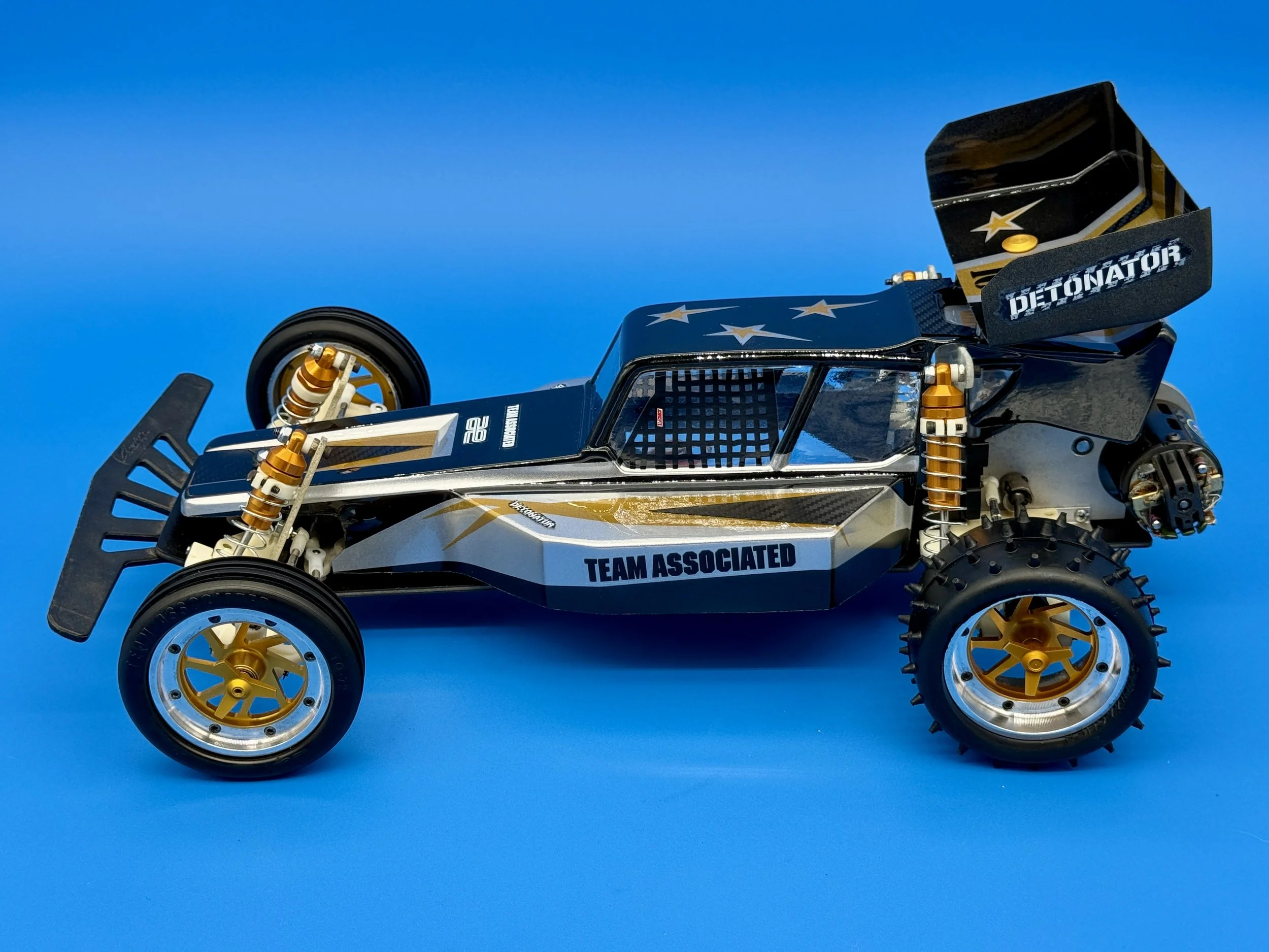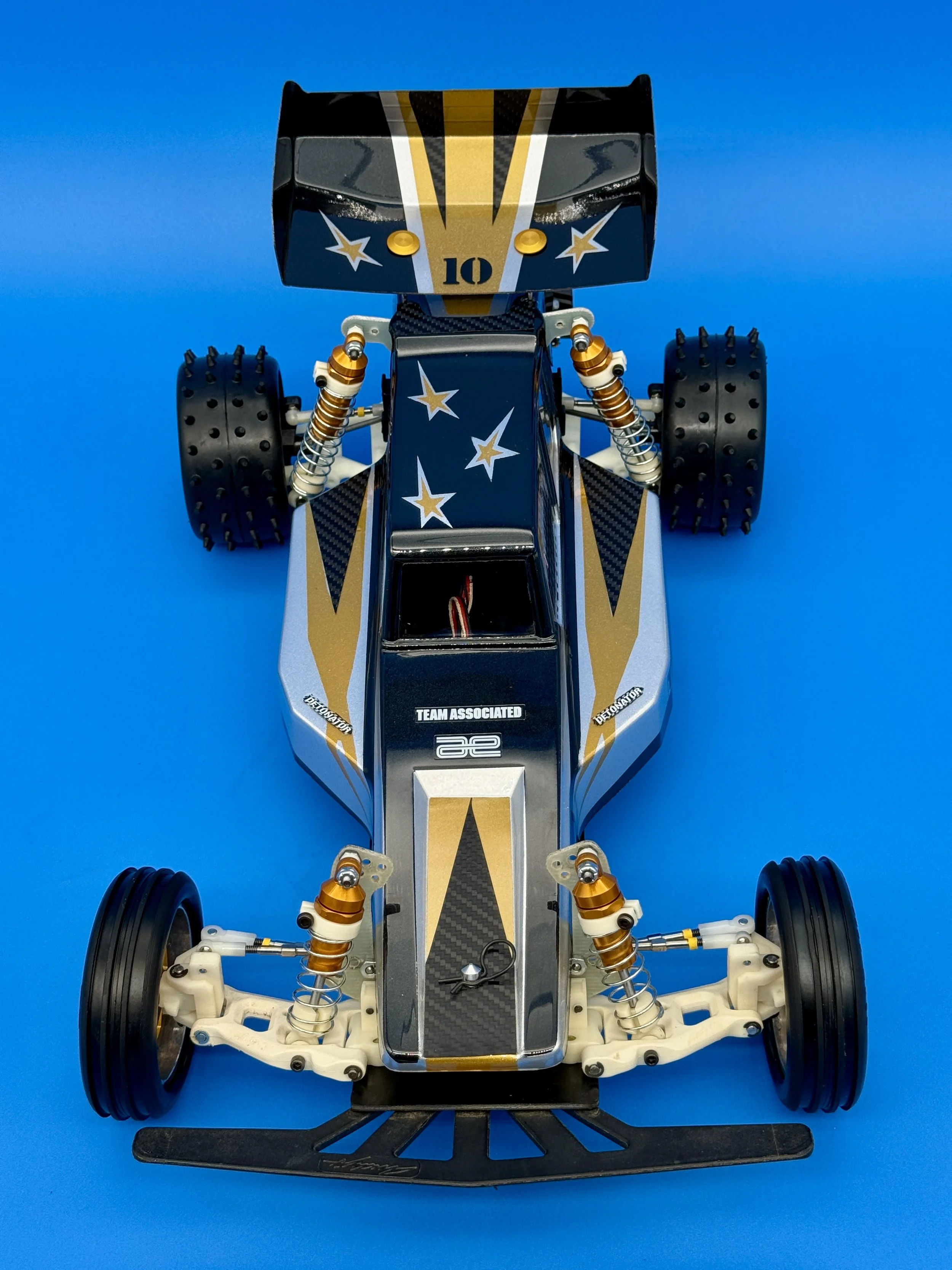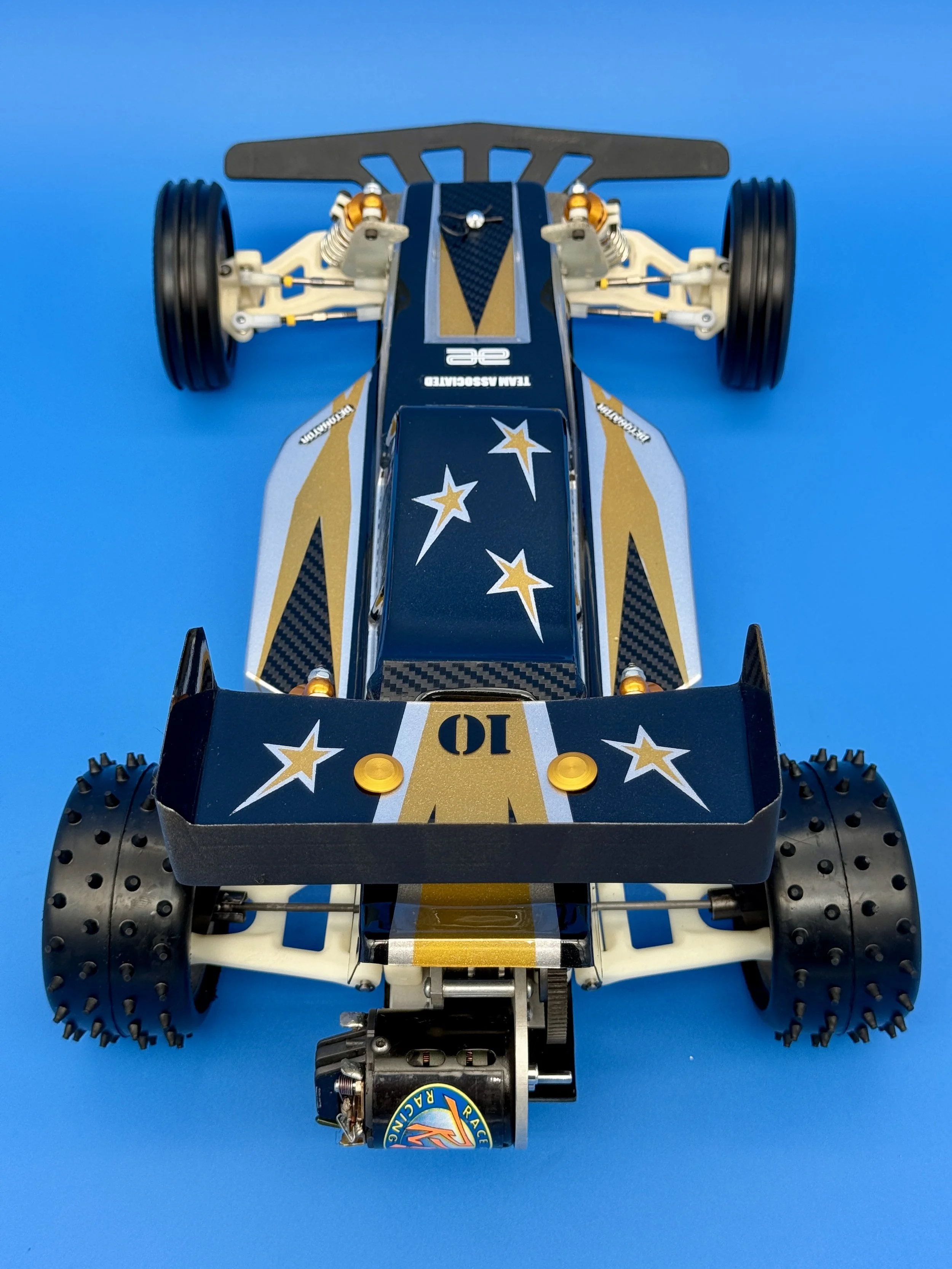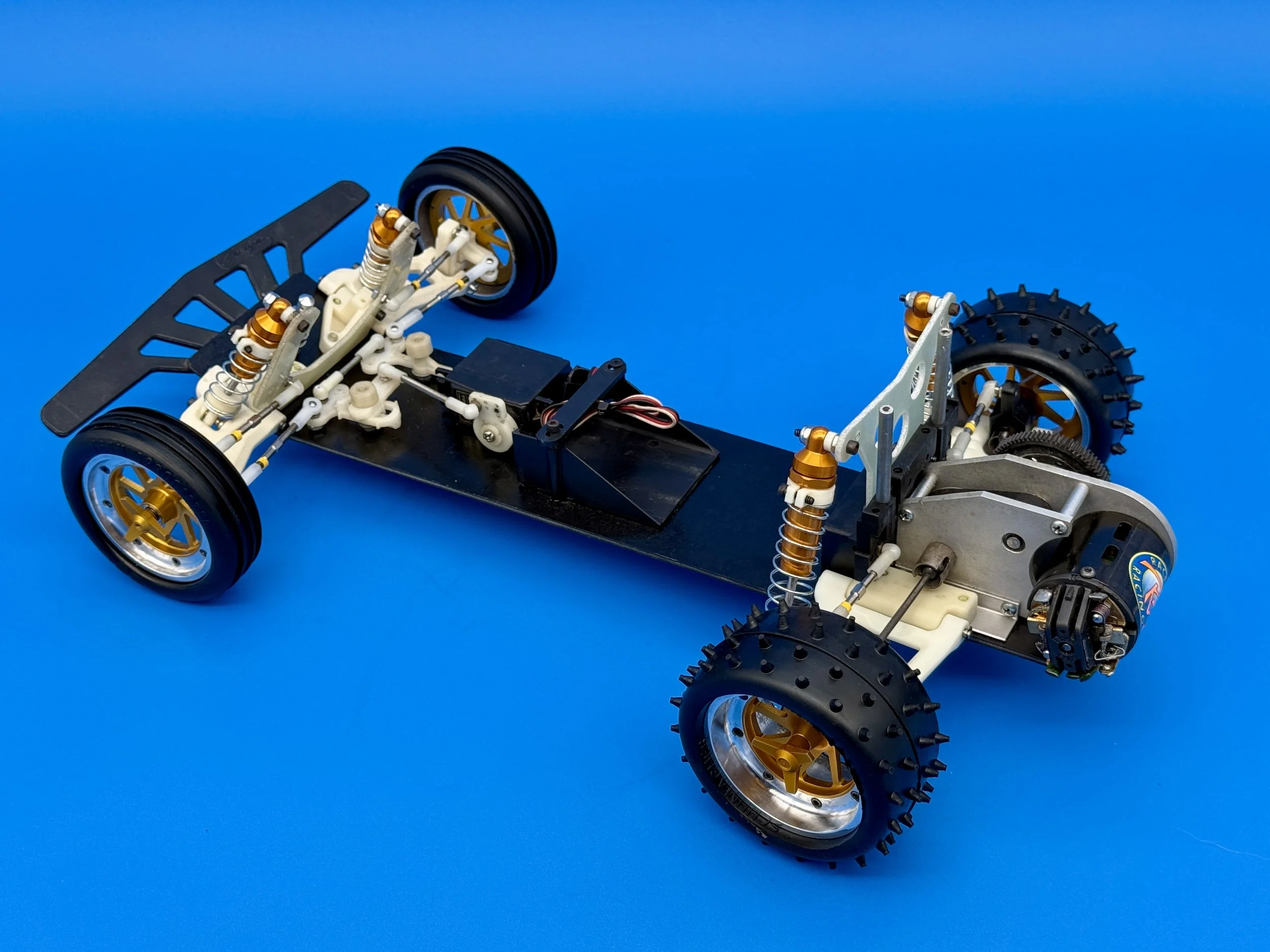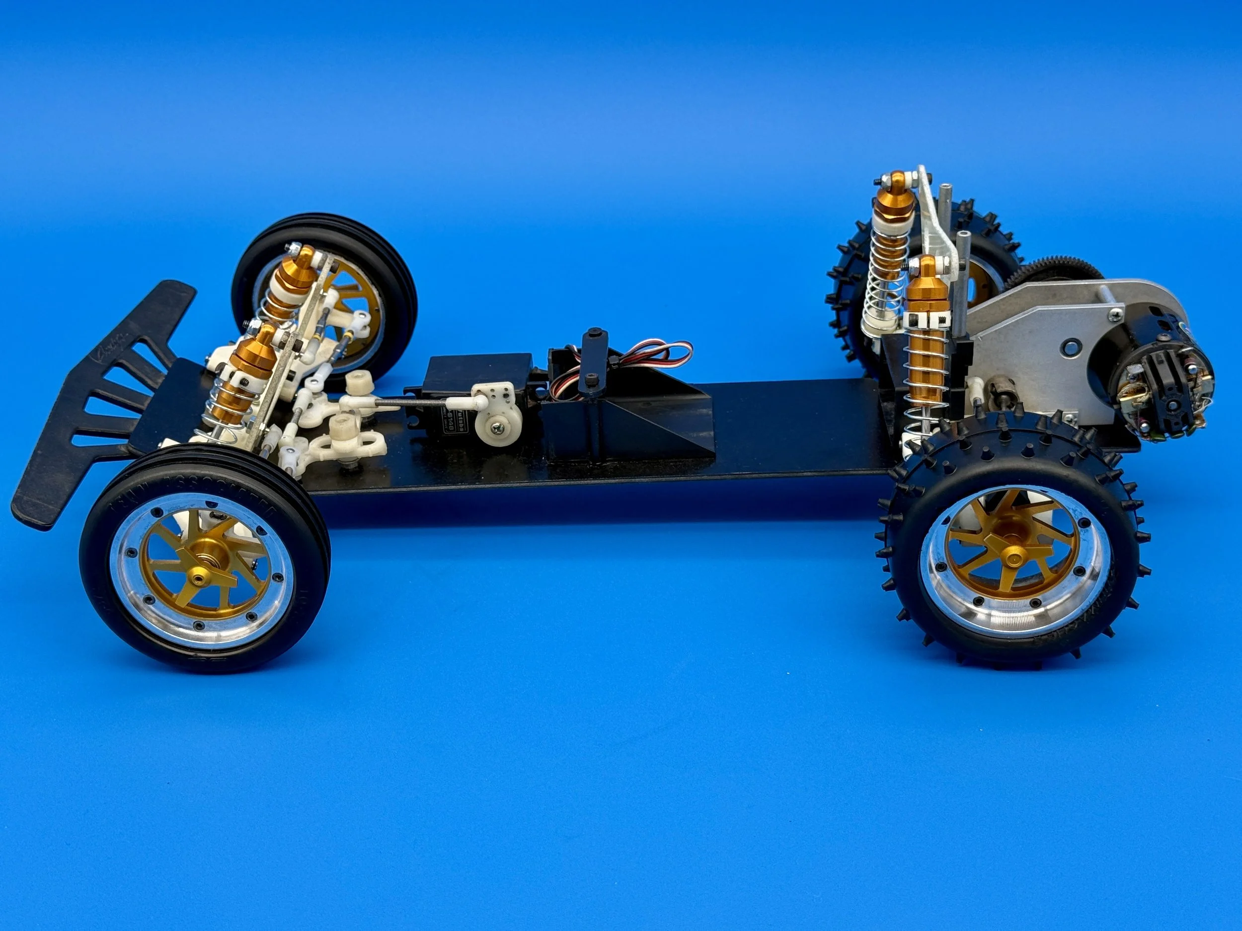 RC10 with Composite Craft chassis coupled with a belt driven Trackmaster rear gearbox. Andy’s front and rear arms. Original vintage Technacraft wheels.